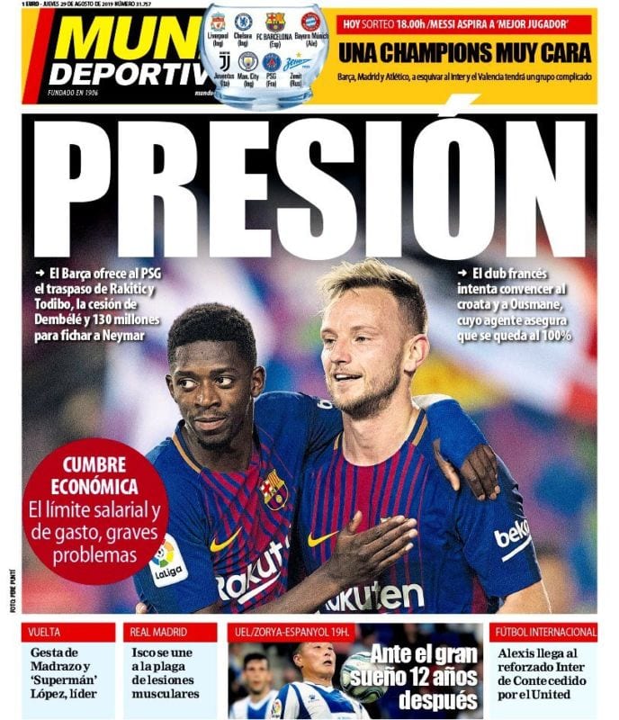 Buenos días. El PSG rechaza la oferta del Barça por Neymar. ¿Por qué? Porque la tenía que rechazar. Porque el Barcelona aspiraba a comprar algo sin pagar por ello el correspondiente precio, y no suelen salir bien las ambiciones de esa índole. El Barça ha hecho un ridículo mayestático tratando de ofrecer a Rakitic, a Dembélé (que ha dicho nones) y a un señor con gafas que sube el Tibidabo en bici todos los domingos y fiestas de guardar, pero nada de esto ha convencido al jeque, por extraño que parezca. También se ha frustrado el fichaje, parece ser, porque la LFP ha protestado acerca de la masa salarial que para el Barça habría implicado la llegada de Neymar. La sensación, por tanto, es que al club catalán le han dado hasta en el carnet de identidad por babor y estribor, que es una cosa que suele pasar a quien a su vez se pasa de listo.