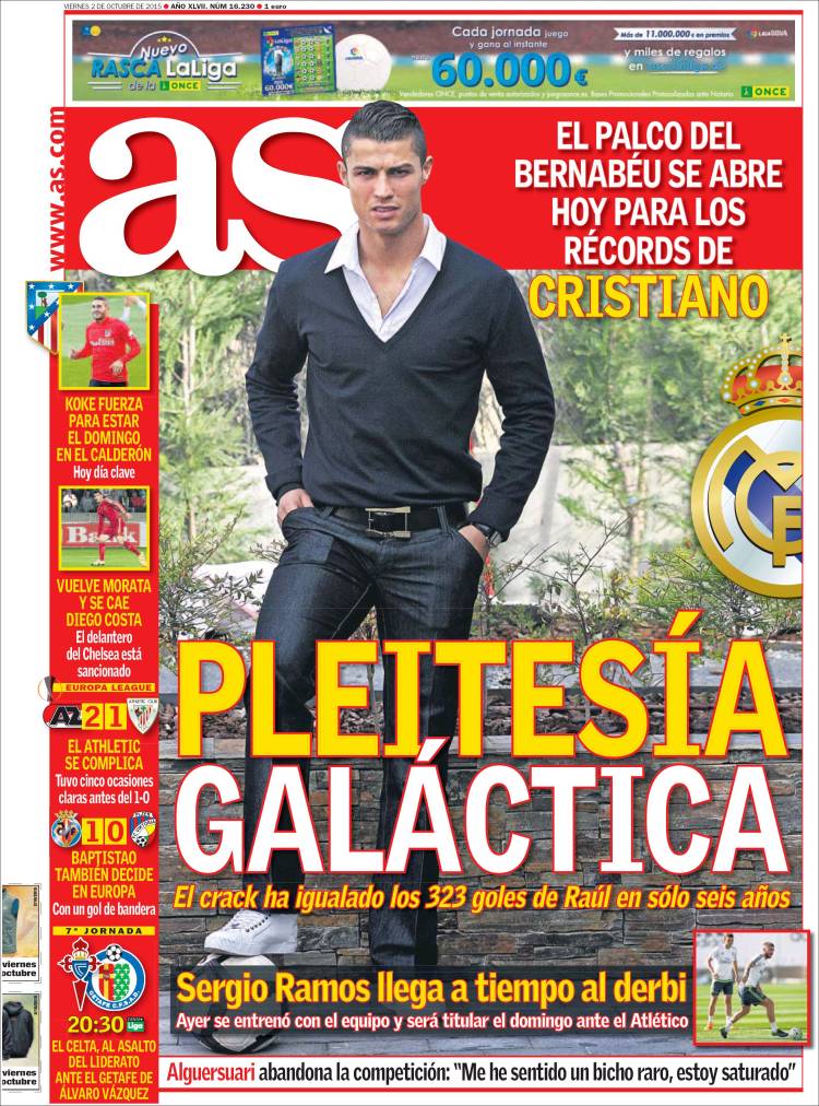 Buenos días. Hoy la Central Lechera oscila entre la horterada sideral de Relaño y el titular medieval de Marca para doblar rodilla ante Cristiano Ronaldo, monarca absoluto del gol. Tanto arriba, tanto abajo, hoy ambos diarios parecen de acuerdo en homenajear al “Pichichi sin gol” –Marca dixit- que ha reventado todos los registros goleadores históricos en el Real Madrid. Se hacen eco de la ofrenda que le hará hoy el propio club en la antesala de la visita al dentista que supone jugar con el Atlético. Como en las grandes ocasiones, se abrirá el antepalco del Bernabéu para honrar los 323 o 324 (ayer nos regañaron por poner tilde en esa "o" internumérica y a nosotros que nos registren) goles de Cristiano tal y como demandan estos registros tan apropiados para la pompa y el boato florentiniano. Y como si del Lehendakari Ardanza en la boda de la Infanta se tratara, ambos diarios se han puesto estupendos para ver si Floren les invita a canapés este mediodía.