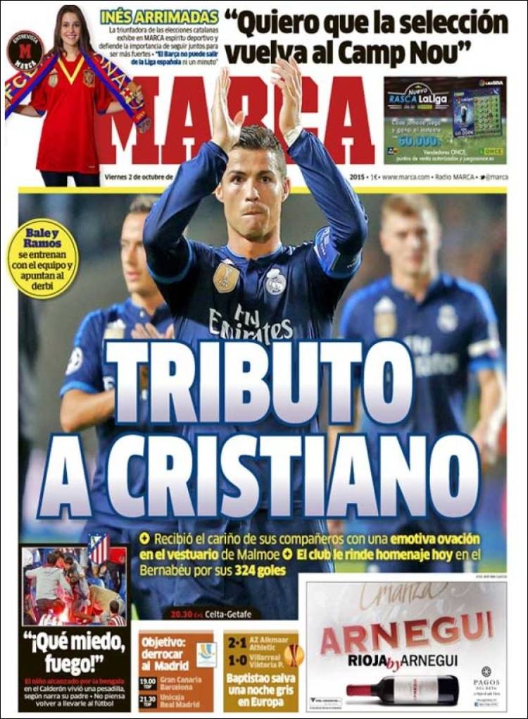 “Tributo a Cristiano” dice Marca en un titular de portada que evoca el señorío (feudal) de la Edad Media. Pudiera parecer con semejante imponente CR7 rompiendo la tipografía marquista- que diría Eduardo Inda- que el adonis de Madeira reclama la prima nocte a una sugerente Inés Arrimadas que hoy habita en la azotea. Ay Inés, pobre. Quiere arrimar a la selección al Camp Nou cuando es más fácil que un cerdo sobrevuele el Bernabéu, como diría un autóctono con selección nacional propia como JB Toshack. Una de las grandes paradojas del momento es que Piqué no jugara jamás con la selección en el único campo de España (ejem) que le respetaría vistiendo la roja.