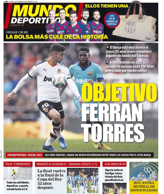 SI lo de Sport es patético, aún no se ha inventado la palabra para describir lo de Mundo Deportivo, que toma por todavía más tontos a sus lectores que Sport (no sabemos si son en esencia los mismos lectores) por cuanto quiere venderles no la moto de Neymar, sino la de Ferrán Torres. Un mundo de ilusión, lleno de alegría y de pasión. Vamos todos al circo con cara taciturna mientras el padre escolapio que nos guía restalla al frente de la comitiva una sonrisa profidén que a nadie contagia.
