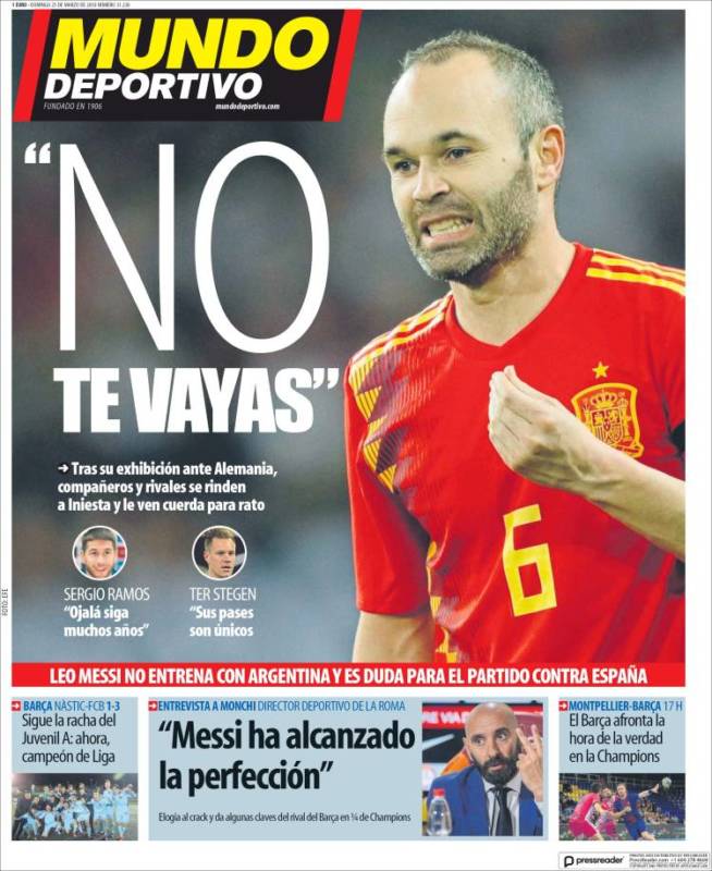 Si Marca se pone a los pies de Leo, Mundo Deportivo lo hace a los pies del hombre que tiene a sus pies a Fuentealbilla desde su madridista infancia. Sea cual sea la decisión que tome respecto a su futuro, le deseamos lo mejor a Iniesta, un adversario de rango mayor que por imperativo del Hado hubo de jugar toda la vida en el club del método Guardiolavski (Mario de las Heras dixit) que tan escasamente encaja con su perfil personal.