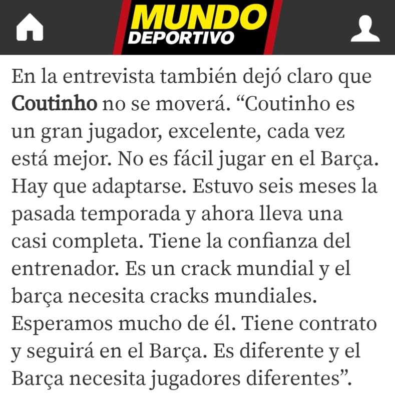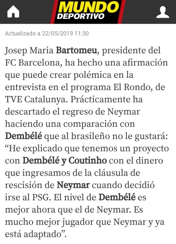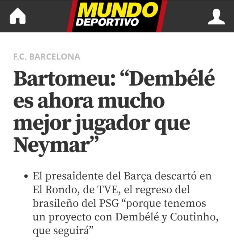 Ahí lo tenéis. Mayo de este mismo año. Apenas tres meses. Dembélé ya era mejor que Neymar y hasta Coutinho era halagado por Bartomeu. De hecho, el ahora jugador del Bayern iba a seguir sí o sí en el Camp Nou según su presidente. No obstante, era un crack mundial y el Barcelona necesita cracks mundiales. El problema es que los hechos mutan y ya se sabe.