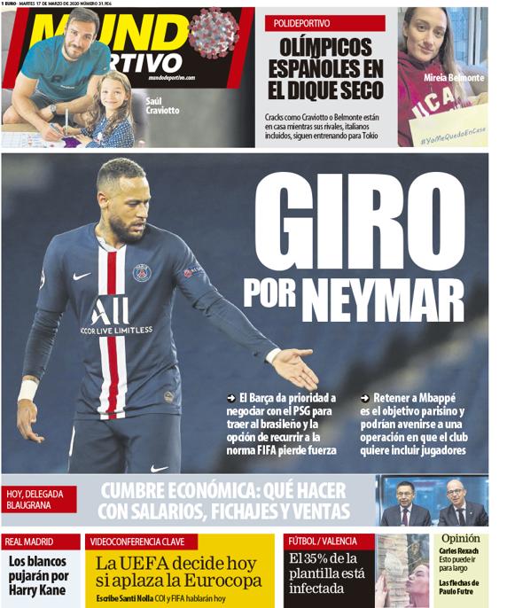 El “mercado en tiempo de coronavirus”, como refiere entre bambalinas un erizado (imaginamos) Ernest Folch, es también la prioridad de Mundo Deportivo, que aparece de buena mañana con ¡Siney! Neymar otra vez rondando los pensamientos del cataculerismo es como esas viejas historias de rencillas y pasiones de los pueblos. Es un poco como en Romeo y Julieta, o mejor, como en West Side Story, por las canciones que parecen salir siempre de esas portadas en las que el amor, a pesar de los navajazos del entorno neymariano, siempre triunfa. Nosotros, siempre que Junior protagoniza un nuevo anhelo (el mismo de siempre, una suerte de comodín) en la fachada de este mundo alucinante, escuchamos: I feel pretty/Oh, so pretty/ I feel pretty and witty and bright/ and I pity/any girl who isn’t me tonight... con verdadero encanto, agradecidos por la distracción y la melodía, más en estos tiempos terribles y difíciles e inciertos en los que resulta complicado ponerse con tanto donaire en los zapatos y entre las gasas de Natalie Wood.