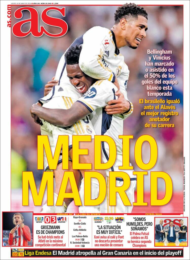 AS personifica en Bellingham y Vinícius la pujanza del campeón de Liga y finalista de Champions. Son tal vez los dos mejores jugadores del mundo en este preciso momento, y ambos visten de blanco. As explica la capital importancia del dúo en el juego del campeón. A pesar de las campañas de insidias que han hablado de lo contrario, su relación personal es, además, inmejorable. La foto que ilustra la portada del diario madrileño no es casualidad.