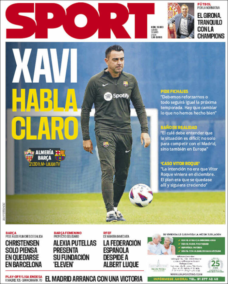En el país pequeño de la esquinita (Pep dixit), entretanto, todo son sinsabores. Dice Xavi que la situación es "muy difícil" en lo financiero, lo deportivo y lo institucional, y hay por ahí un candidatable amenazando con una moción de censura contra Laporta. La cosa es tan seria que dicho candidato se ha permitido comparar la marcha actual del Barça con la del Madrid y uno de los dos clubes no ha salido muy bien parado, siendo el que no ha salido muy bien parado el suyo propio. Ouch.