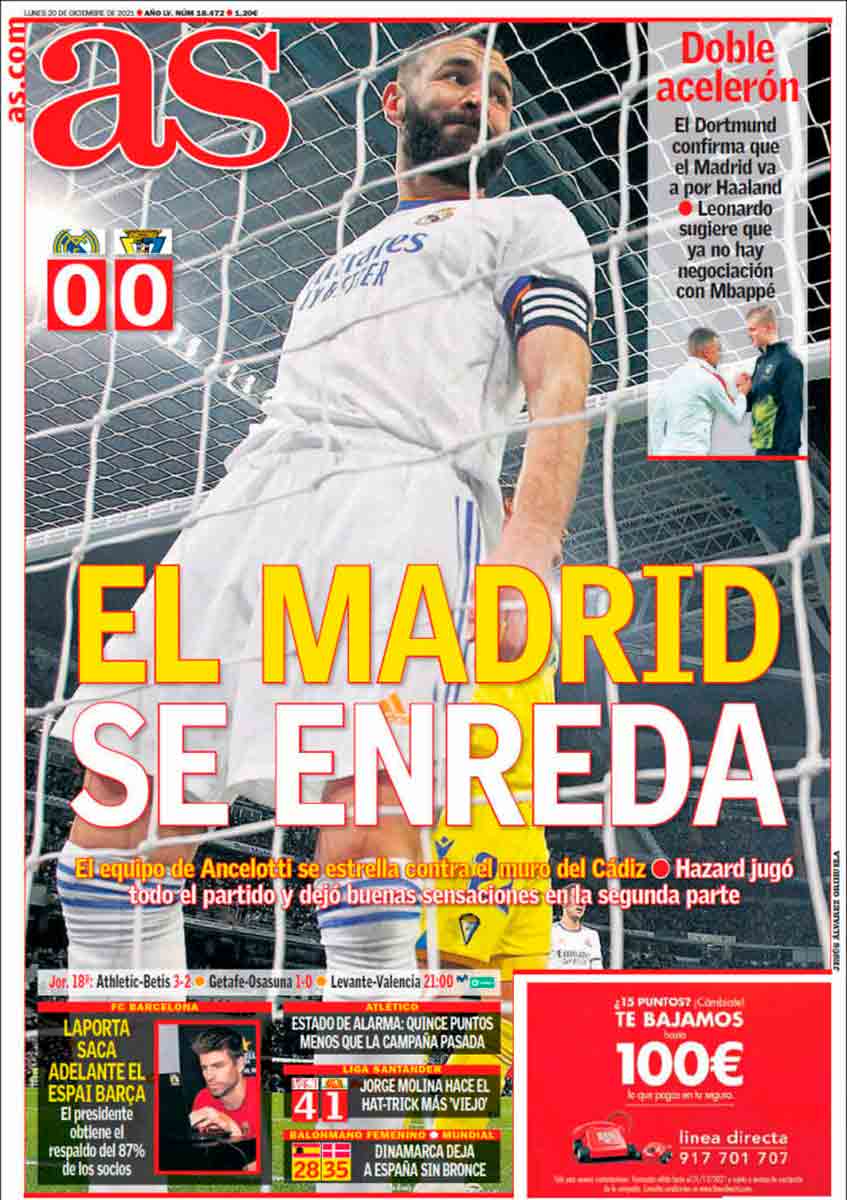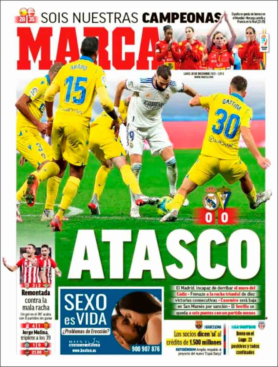 Gracias a ellos, que no a Movistar, sabemos que ayer le hicieron tres posibles penaltis al Real Madrid en su decepcionante empate a cero en el Bernabéu contra el Cádiz. Tampoco lo sabemos precisamente gracias a la prensa del día ni a sus portadas, que se limitan a resaltar lo que es de Perogrullo, es decir, que empatar contra el Cádiz en casa es un contratiempo, y que el Madrid, que no pudo marcar gol en la portería de un excelente Ledesma, se quedó en el atasco.