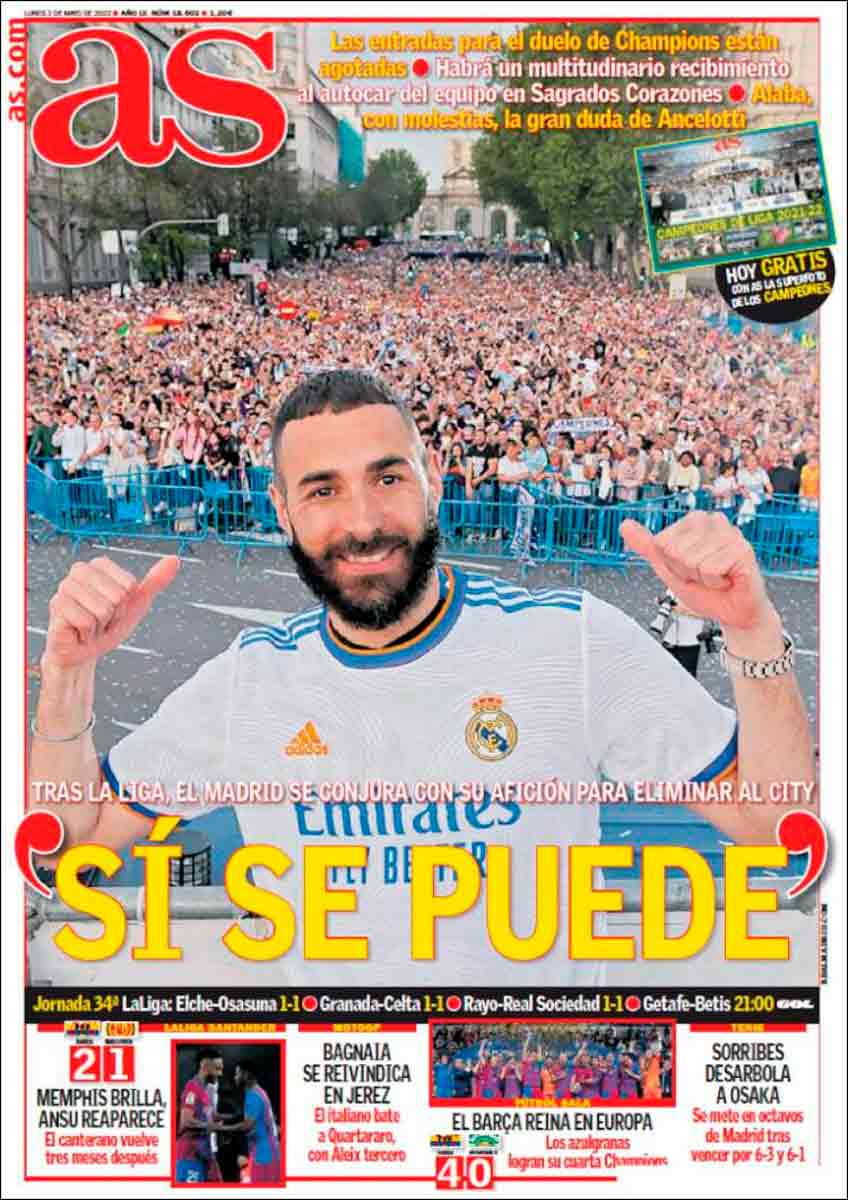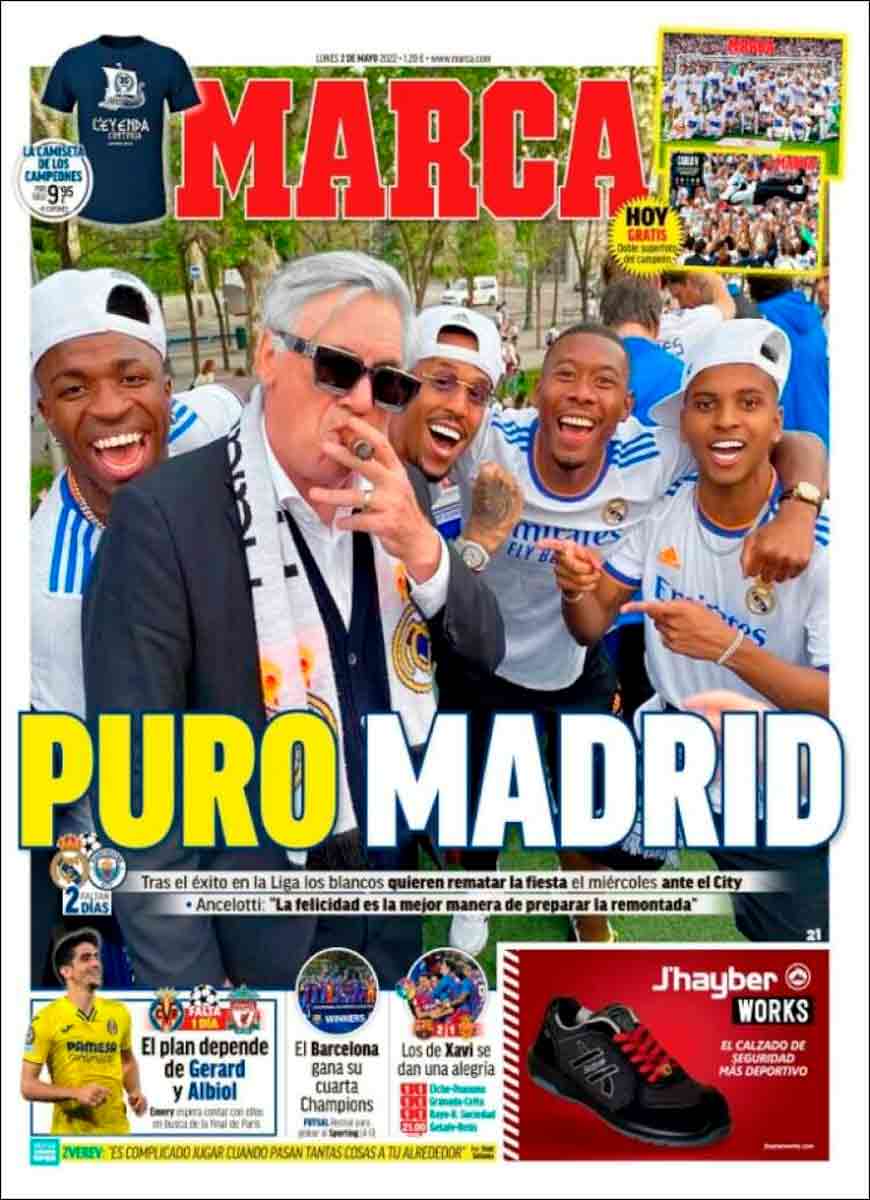Inevitablemente, sin embargo, los fastos ligueros nos causan aún gran algarabía interna, y las reacciones ante el éxtasis de Cibeles deben todavía ocuparnos. Nos gusta mucho la portada de Marca, la cual amplifica el impacto de la foto que ya es icónica: la de Carlo Ancelotti con gafas de diseño fumando un puro junto al gang brasileño (al que pertenece el austríaco Alaba, por supuesto) en lo más alto del cielo, es decir, el autobús del Madrid que recorrió Castellana camino Cibeles para recabar los vítores de -se dice- unos 250.000 madrileños. Qué atardecer más bello, amigos nuestros.