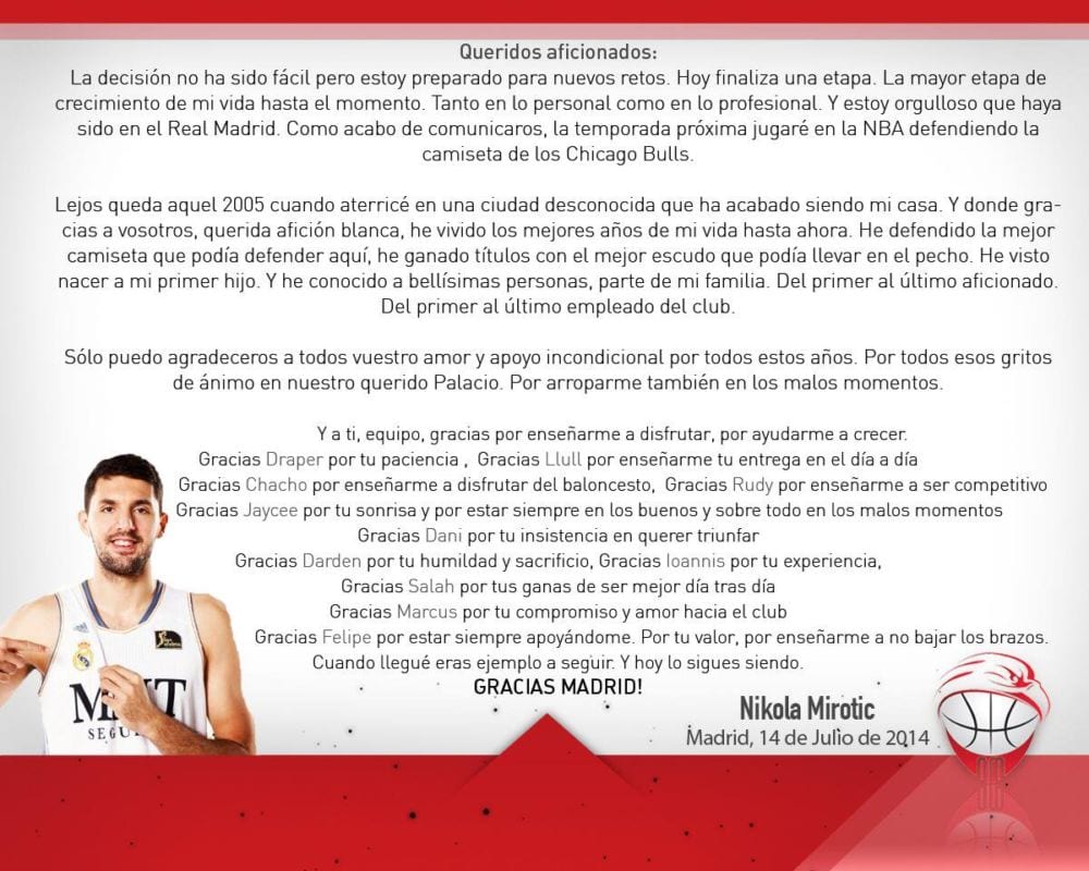 El caso es que Mirotic tiene todo el derecho del mundo a elegir destino, solo faltaría, pero no deja de sorprender que no dudara en la elección por la que ha optado, sin tan siquiera valorar otras en Europa - según rezan todas las informaciones - y por qué no, incluso sondear al club blanco. Mucha gente ha aludido a su condición de profesional extranjero como un factor que le excusa de posibles simpatías hacia un exequipo. Pero es que el Real Madrid para Nikola Mirotic no era un club ajeno. El caso de Mirotic no guarda relación, ni por asomo, con el de Ante Tomic. El Real Madrid fue el equipo en el que se formó como persona y jugador durante nueve años. Al que llegó en 2005, con tan solo 14, y del que se fue en 2014, con casi 24. A Nikola le hemos visto ser feliz con esa camiseta, llorar con ella, animar a su equipo de fútbol desde la grada del Bernabéu, celebrar los títulos de las dos secciones madridistas desde las redes sociales, proclamar el orgullo de representar al Real Madrid en la NBA y hasta afirmar que jamás jugaría en el F.C. Barcelona. Tenía a un club y a una afición que le adoraba y ha decidido renunciar a ello a cambio de no sé sabe todavía qué.
