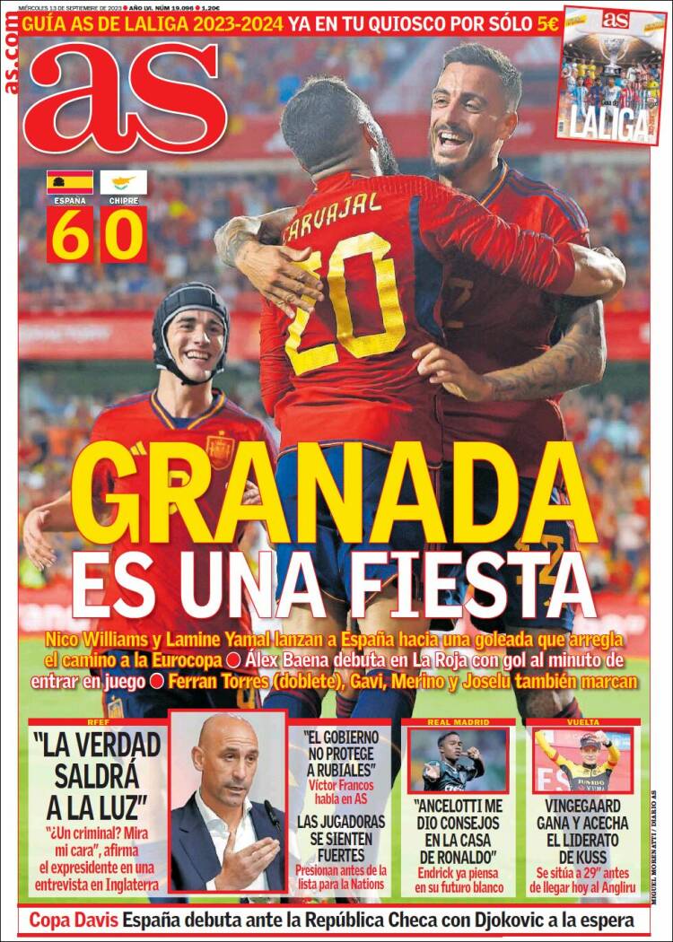 Buenos días. Aunque el rival fuera endeble, la selección española de fútbol se esforzó anoche por contentar a sus seguidores con una agradecible goleada granaína, y vive Dios que lo logró. 6-0 a Chipre en el camino de clasificación para la Eurocopa, que ese era el fin del encuentro, o al menos eso nos dicen quienes justifican que las competiciones de clubes se paren ¡en septiembre! para hacer hueco a estas pachangas.