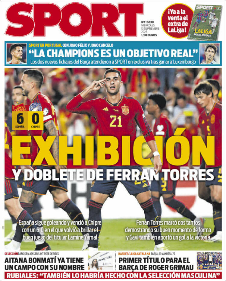 Sport arrima exactamente el mismo ascua a exactamente la misma sardina que Mundo Deportivo. Ve lo rojigualda color blaugrana, que ya son ganas de ver. Ferran Torres se lleva dos dedos a la frente, no sabemos si tal vez porque carece de ellos de manera natural, pero nos alegra en todo caso que el Yernísimo sea capaz de brillar lejos de la protección de los vínculos legales de los que antes hablábamos.”Pon un cuñado en tu vida” es lema que parece funcionar para Joselu y Carvajal. “Quita un suegro de la tuya” es otro que parece ir bien, en este caso y contra todo pronóstico, al bueno de Ferran. Nos congratulamos.