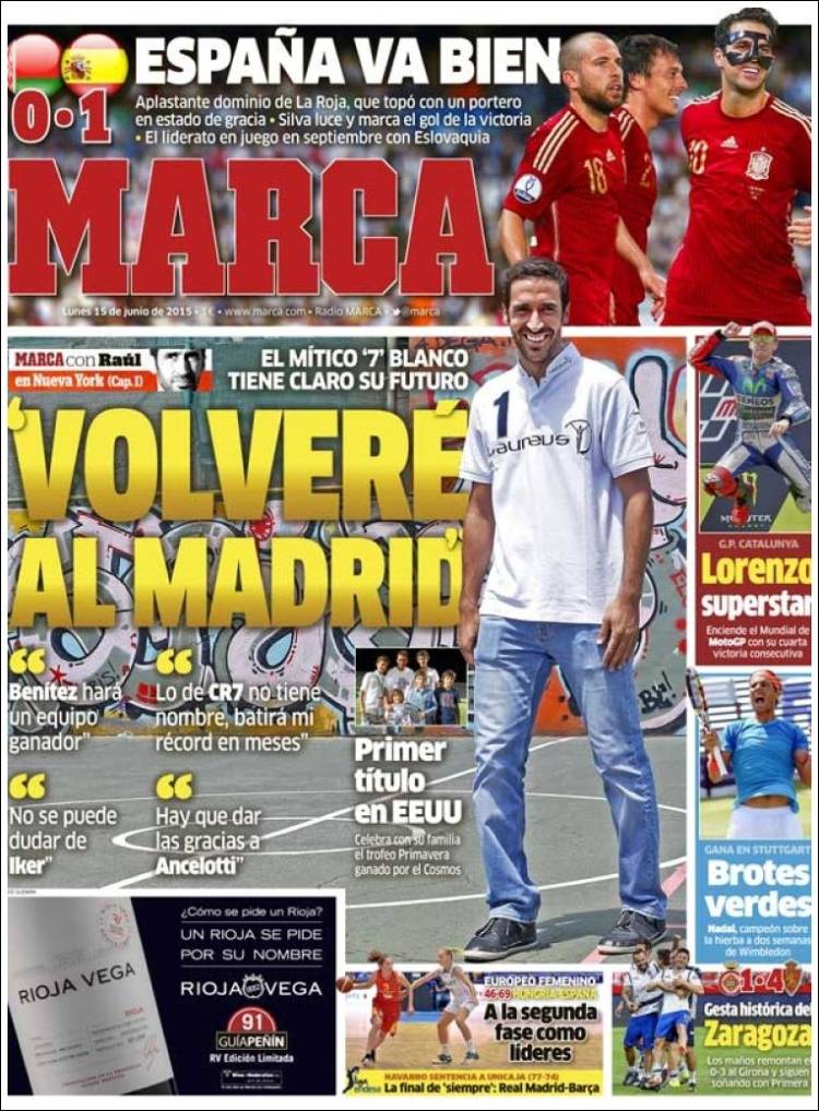 Raúl González Blanco, señoras y señores. Aunque La Galerna (digámoslo ya sin ambages de ningún tipo) es raulista hasta la médula, nos preguntamos si no hay alguna ligereza en las declaraciones que Marca le atribuye: "Volveré al Madrid". No tenemos nada en contra de la idea per se: quien ha contribuido de manera decisiva a algunos de los mejores logros del club en las dos pasadas décadas podría ofrecer mucho, desde la posición que fuese, a la hora de intentar reeditar o incluso superar dichos logros en el futuro. La clave es el condicional: podría.