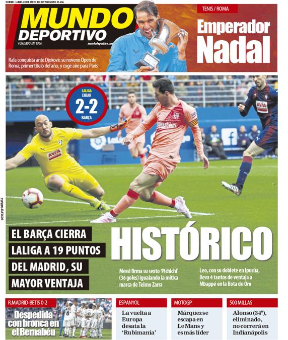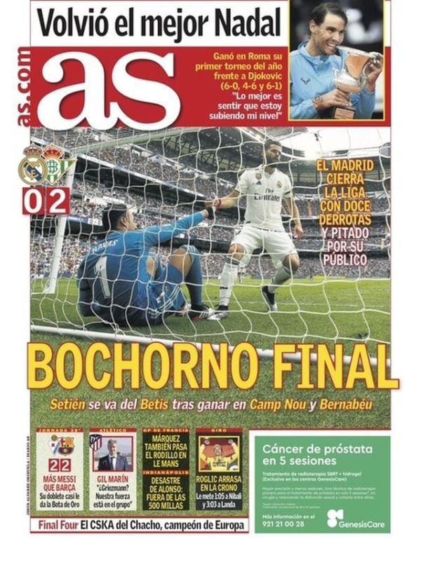 Por lo demás, Sport y Mundo Deportivo sugieren una pronta visita a Canaletas a cuenta de la máxima ventaja (19 puntos) de la que antes hablábamos. La falta de sintonía de estas dos portadas con el sentir de la masa social blaugrana es meridiano, como cualquiera sabe. El varapalo de Liverpool tiene aún al culerio muy lejos de la tentación de ir a Canaletas ni a ninguna otra parte. La afición del Barça no va a cerrar la temporada en un estado de ánimo mucho más halagüeño que el de la afición madridista, por mucho que su prensa de cabecera quiera dar a entender lo contrario.