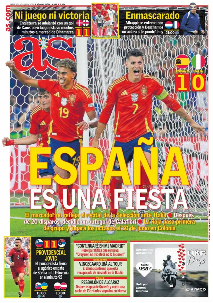 Pues sí. "España es una fiesta", y lo seguirá siendo si prosigue en esta senda de excelencia. Como también dice As, el marcador "no refleja" la superioridad hispana. Habrá que ver a este equipo frente a escuadras con verdaderos pesos pesados en la delantera (Mbappé, Kane, Havertz), sobre todo si De la Fuente persiste en alinear a jóvenes que juegan en Arabia por encima de quien acaba de ganar su sexta Champions League, pero de momento juega mucho y bien. Carvajal es la gran estrella consagrada, aunque juegue en una posición tan poco "de" estrellas; en el centro del campo, ha afianzado el dúo Rodri/Fabián, jugador boya + box to box en vías de consagración; arriba, dos auténticas perlas como Nico Williams y Lamine Yamal, que están deslumbrando, acompañados por un Morata que demuestra más sus dotes goleadoras cuanto más se olvida de combatir mediáticamente una inexistente campaña en su contra.