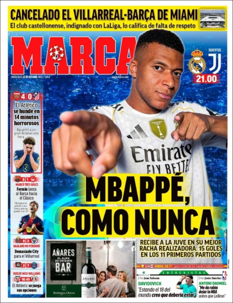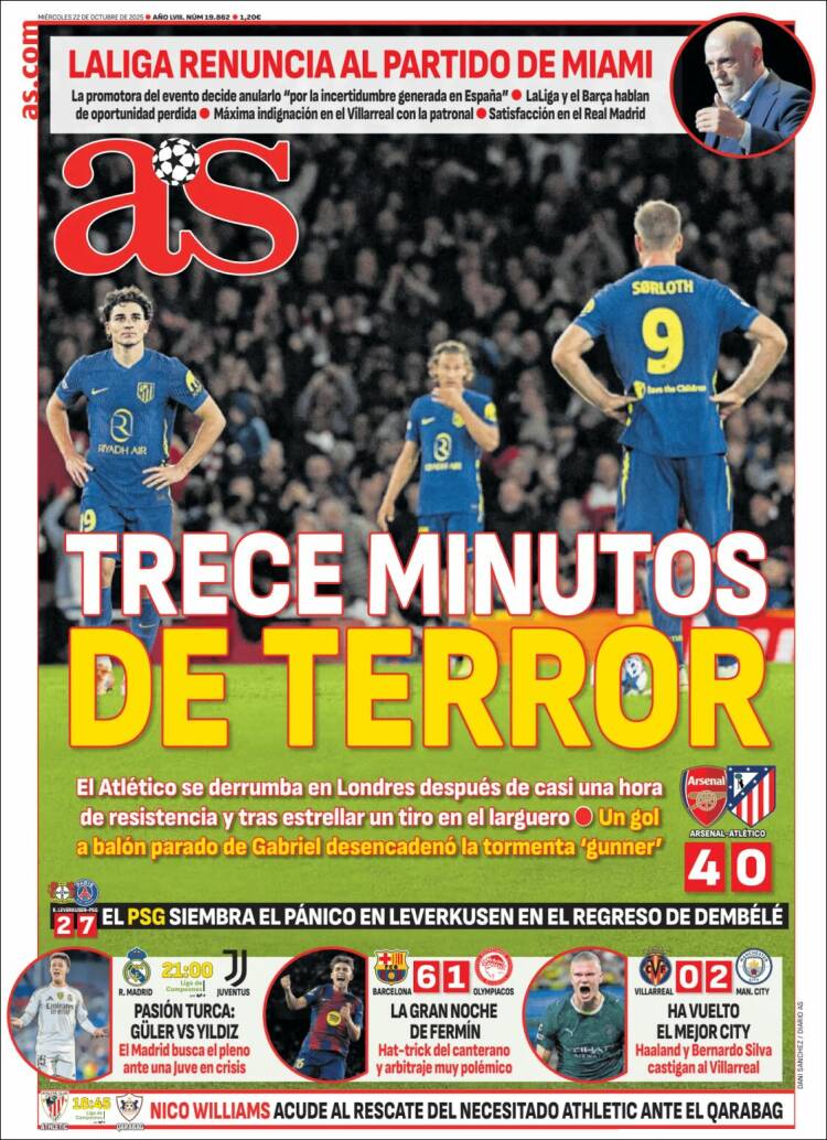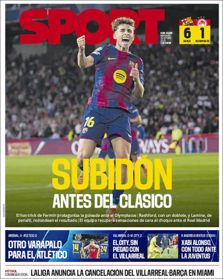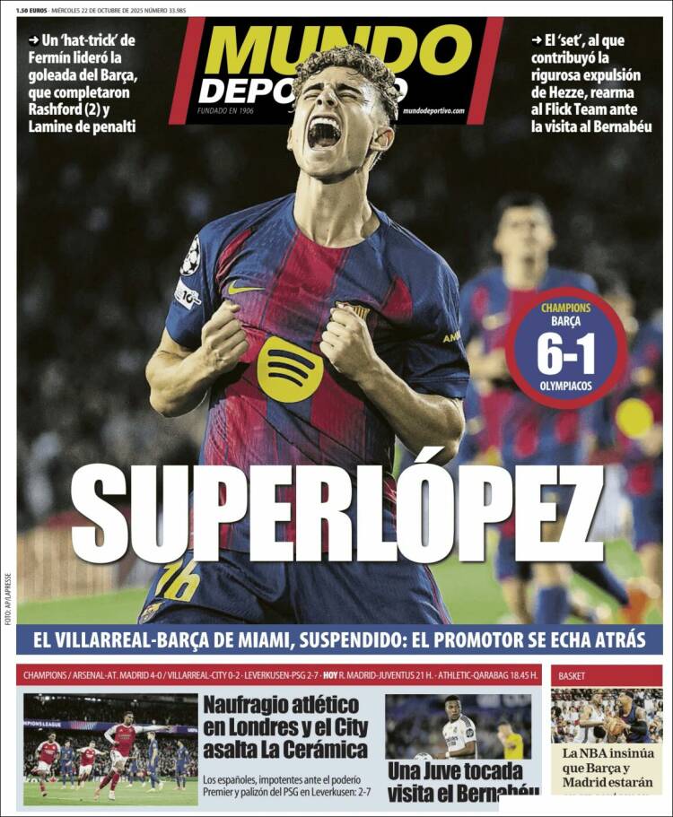 Los chicos de Tebas de Barcelona llevan en su portada el 6-1 del Barça a Olympiacos. Cómo sería la magnitud del robo sufrido por los griegos, que Mundo Deportivo califica como «rigurosa» la expulsión de Hezze. Recordemos que fue él quien sufrió la falta y no quien la cometió. Parece que el compadreo de Laporta con Ceferín y el que juega al pádel con los de Marca está dando ya sus frutos.