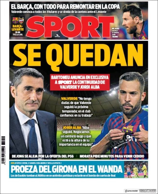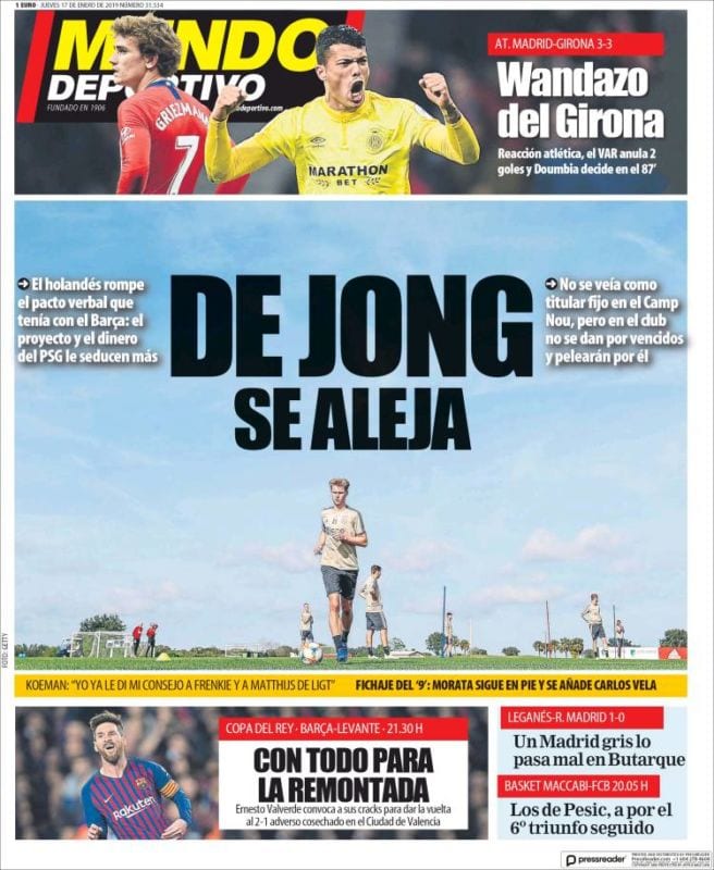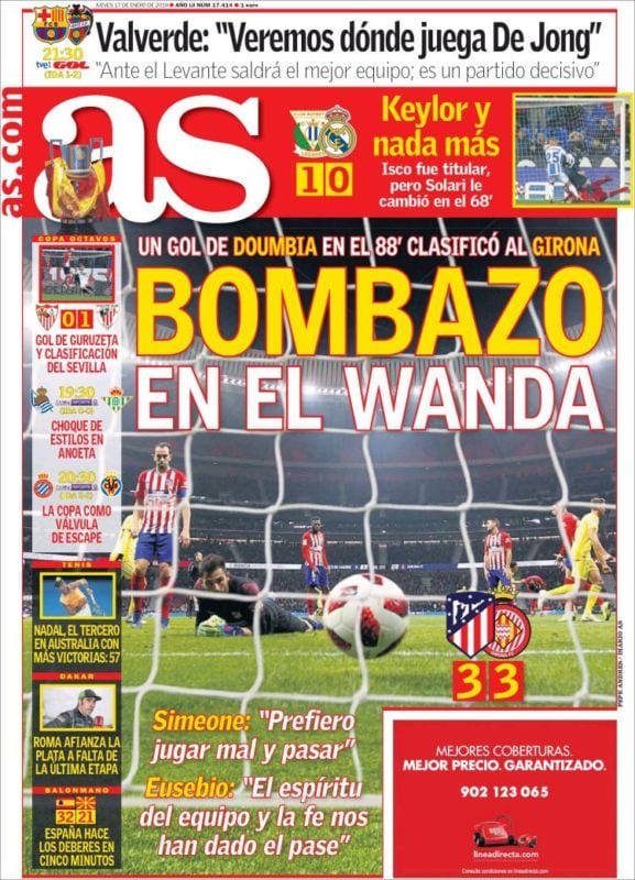 Anoche cuando me acosté tuve un sueño. Soñé que esta mañana al levantarme encontraría en la prensa palos al Atlético de Madrid por su ridícula eliminación frente al potentísimo Girona y cierta condescendencia(aunque no mucha, la verdad)con el Madrid por su intrascendente derrota de anoche en Leganes, que dadas las circunstancias (lesiones, descansos y eliminatoria resuelta)no era más que eso, intrascendente.