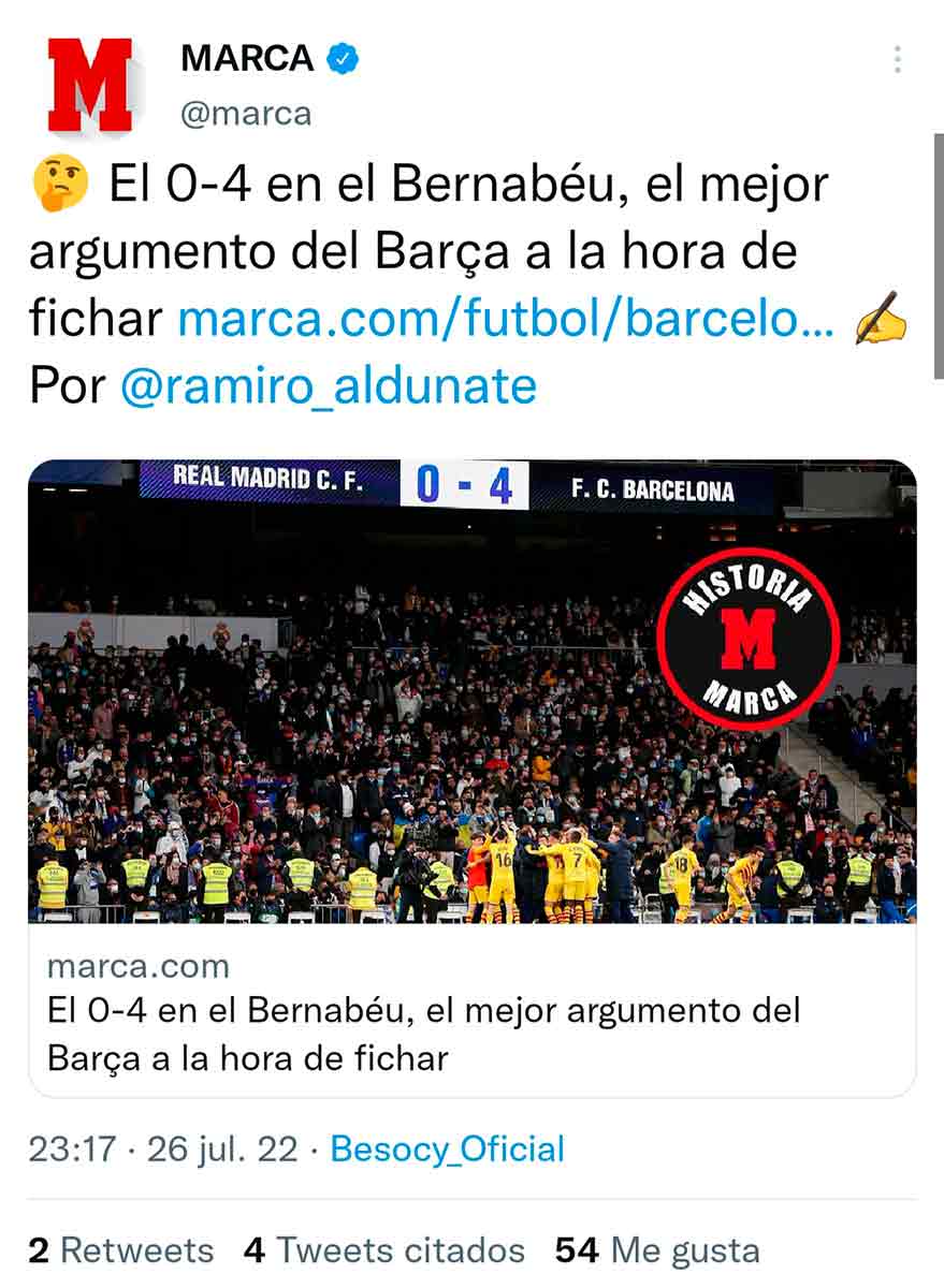 “Así, aseguran que ese partido fue la mejor tarjeta de presentación, el mejor desengrasante de negociaciones que se pudiera tener. Futbolistas que mostraban ciertas dudas a la hora de dar el sí a los azulgranas, que estaban valorando otras ofertas, se decidieron por vestir la camiseta del Barça, explican”. Está clarísimo, Marca, el 0-4 acabó con cualquier duda de nadie para fichar por el Barça.