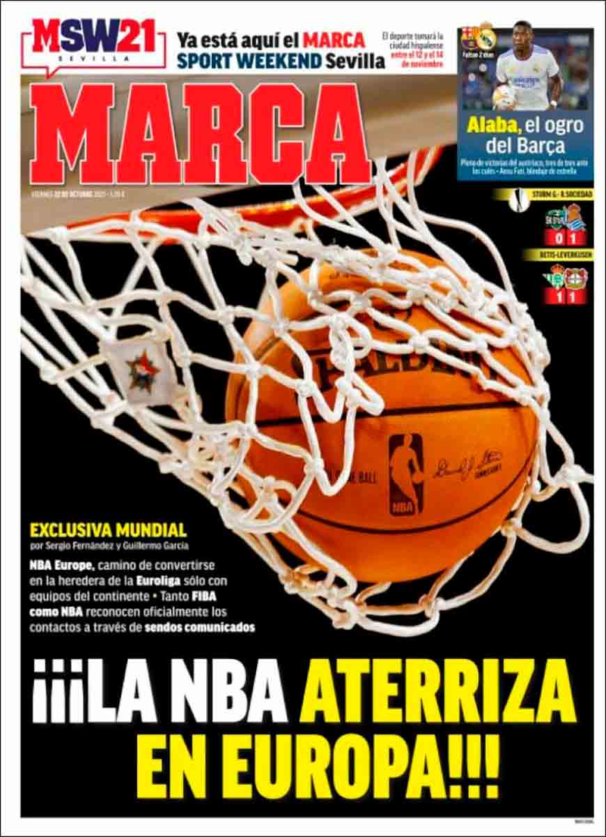 Pero en concreto aburrida no suele ser. Provoca a menudo ira y con frecuencia hilaridad, partidas ambas del alma incompatibles con el tedio. Desconcertante no suele ser tampoco palabra que la defina, ya que a la prensa deportiva patria suele vérsele venir desde el reino de Swazilandia, por poner un paraje remoto. Suele saberse de dónde viene y a dónde va. Hoy la portada de Marca, sin embargo, es un rascacabezas de manual. A dos días del clásico, cuando ya todos esperábamos la consabida doble foto de Vinícius y Ansu Fati velando armas, se descuelga con una exclusiva baloncestística en virtud de la cual se estaría cociendo un acuerdo NBA-FIBA para la creación de una NBA europea.