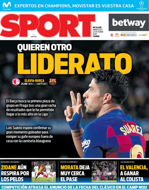 Nos gusta la primera página de 'Sport', resaltando la palabra "liderato" por aquello de que cogieron el de la Liga el fin de semana y quieren también el de la Champions League. Llevan años los culés celebrando lideratos europeos en otoño y llorando en primavera. Alguien les debería recordar que en el Viejo Continente no se festeja nada hasta mayo o junio.