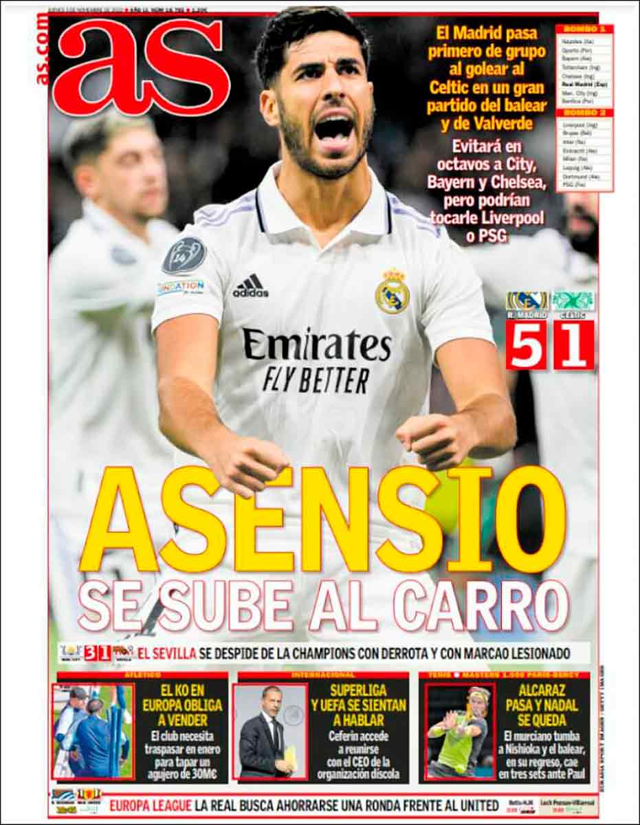 As dedica su primera plana a Marco Asensio, a nuestro juicio el futbolista más destacado del partido de ayer. “Asensio se sube al carro”, titulan. A Marco no le robaron el carro, sino el ímpeto, el compromiso, la presencia, el espíritu, las ganas, todo aquello que no se ve pero sostiene e impulsa a un jugador porque solo con la calidad ya no llega en el fútbol de hoy. En realidad no se los robó nadie, salvo él mismo. Deseamos de todo corazón que Asensio siga así.