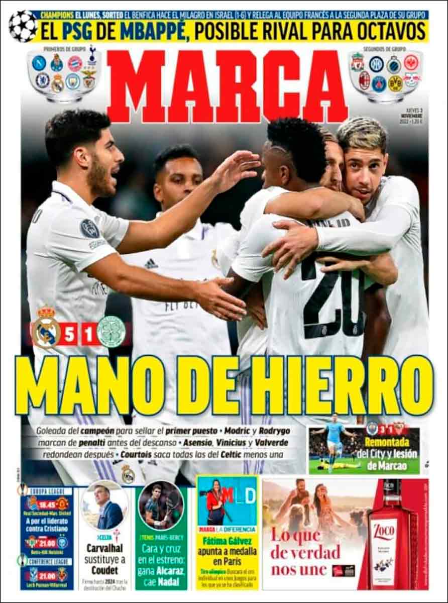 Marca titula “Mano de hierro” y no se refiere al nombre del malo de una película de James Bond, sino al modo en el que el Madrid selló el primer lugar del grupo, e ilustran la portada con una instantánea de varios futbolistas del equipo blanco abrazándose con manos de carne y hueso.