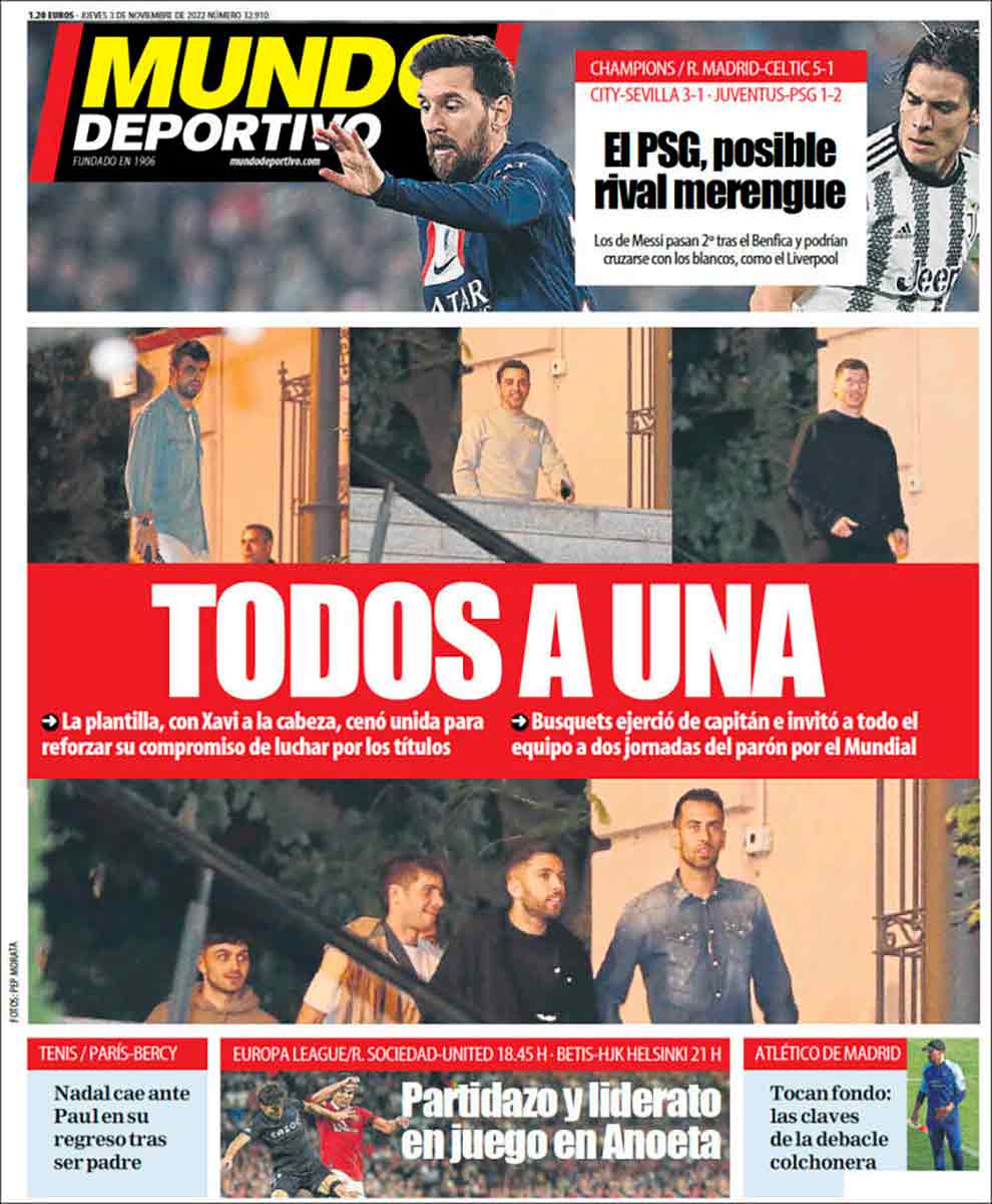 Los de Godó titulan: “Todos a una”, pero no están en Fuenteovejuna, sino en algún lugar invitados por Busquets, el capitán. Mundo Deportivo asegura que se trató de una cena de la plantilla para reforzar su compromiso de luchar por los títulos. Por los títulos menores, añadimos.