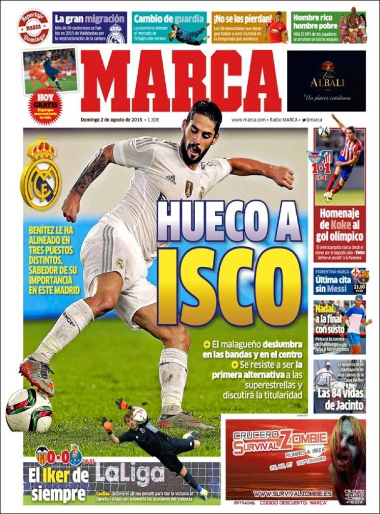As, en cambio, no deja en paz a Casillas (ni a nosotros sin él). Tanto es su deseo de ensalzarlo, y a la sazón, de afear que el Madrid lo haya dejado marchar. Mucho nos tememos que cualquier nuevo acierto de Iker (y ojalá tenga muchos) va a ser utilizado como un siempre malsano "te lo dije" que Relaño estará encantado de escribir en su editorial, tal vez salivando más de lo acostumbrado. En consecuencia, la zona superior de la portada que As nos presenta hoy celebra con caracteres de buen tamaño la notable actuación de Casillas con el Oporto. No tenemos ningún problema con esta celebración, aunque sí nos llama la atención que un penalti de pretemporada (que además lanzó un jugador del Valencia al portero del Oporto) merezca un titular tan grande y elogioso. En cualquier caso, a veces el mejor motivo para convocar a los amigos a una fiesta es precisamente que no haya ningún motivo festivo. El arte por el arte, la fiesta por la fiesta y Casillas por Casillas. Así nos fue.