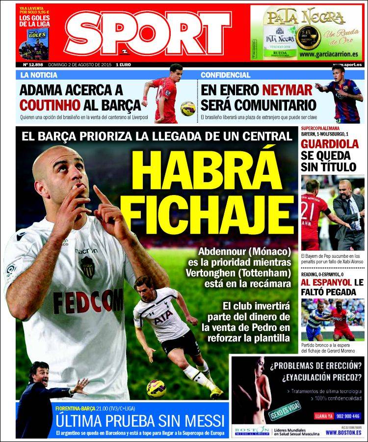 No levanta cabeza Sport. Ya quisiéramos, pero nos cuesta sentir interés alguno por el catálogo de temas que trae hoy a su portada. Ni hasta la nueva derrota del Bayern de Pep en la Supercopa alemana nos alimenta un mínimo el espíritu. Será tal vez porque -en magistral jugada torcida- Sport subtitula esa noticia culpando a Xabi Alonso de la no consecución del título. En todo caso, nos tiene que reconocer el medio catalán que es difícil suscitar interés cuando su principal argumento se refiere a gente -seguro amabilísima y aseada- como Abdennou o Vertonghen (sí, hemos tardado treinta segundos en escribir sus nombres). Menos mal que Neymar será comunitario en enero, aunque no sabemos cómo le sentará la noticia a su padre, al Santos, a los fondos de inversión, al índice Nikkei, o la General Motors. Desde aquí pedimos rueda de prensa conjunta de Barto y Gay de Liébana.