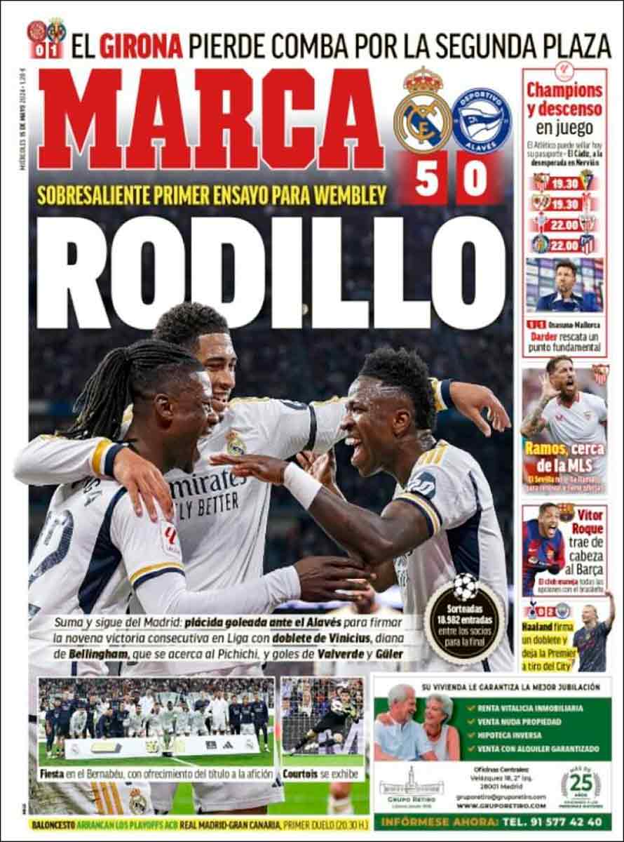 Dice Marca que el Madrid fue un rodillo y no exagera. La exhibición de Vinícius (su segundo gol es para enmarcar) desató en las gradas la demanda del Balón de Oro para el brasileño, cosa justificadísima. Bellingham no se quedó atrás, abriendo el marcador y participando en 4 de los 5 goles, con asistencias y preasistencias para enmarcar. (Aclaramos: no sabemos si en el diccionario panenkita existe la palabra preasistencias, pero de no existir estamos dispuestos a cederla a su acervo cultural sin cargo alguno). Por lo demás, brillaron Valverde (golazo) y el siempre efervescente Camavinga, quien ante la presumible ausencia de Tchouaméni apunta a ser el mediocentro titular en Wembley.