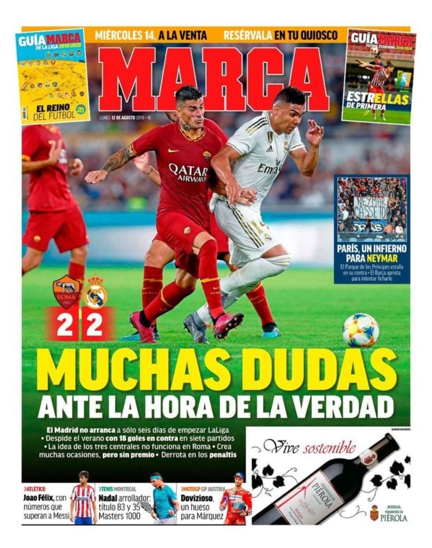 Por su parte, el Madrid empató (y luego perdió en los penaltis) el último duelo de pretemporada, esta vez ante la Roma. Frente a la muy negativa crónica de Quillo Barrios, nos pareció atisbar algún brote verde, pero quizá esto sea el deseo de verlos más que otra cosa. Las señales no son halagüeñas precisamente, si bien esperamos que sucedan cosas antes del 2 de septiembre. “Tú de qué vas mirándome atrás”, canta Chenoa y podrían cantarnos a nosotros Hazard o Isco, que todavía podrían perder algún que otro gramo de retaguardia para dejar de rivalizar con la propia Chenoa sin que eso signifique (ay qué descaro) que ahora nos gusten más. No estamos (no) cansados de cuerpos duros, como le pasa a Chenoa en la canción, pero sí nos encontramos hastiados de mentes blandas que no saben de amor porque han ganado tanto y están (se antoja) tan escasamente autoexigidos que el amor les resbala como rocío mañanero si lo entendemos como denuedo en pos del logro de la amada, que es la gloria.