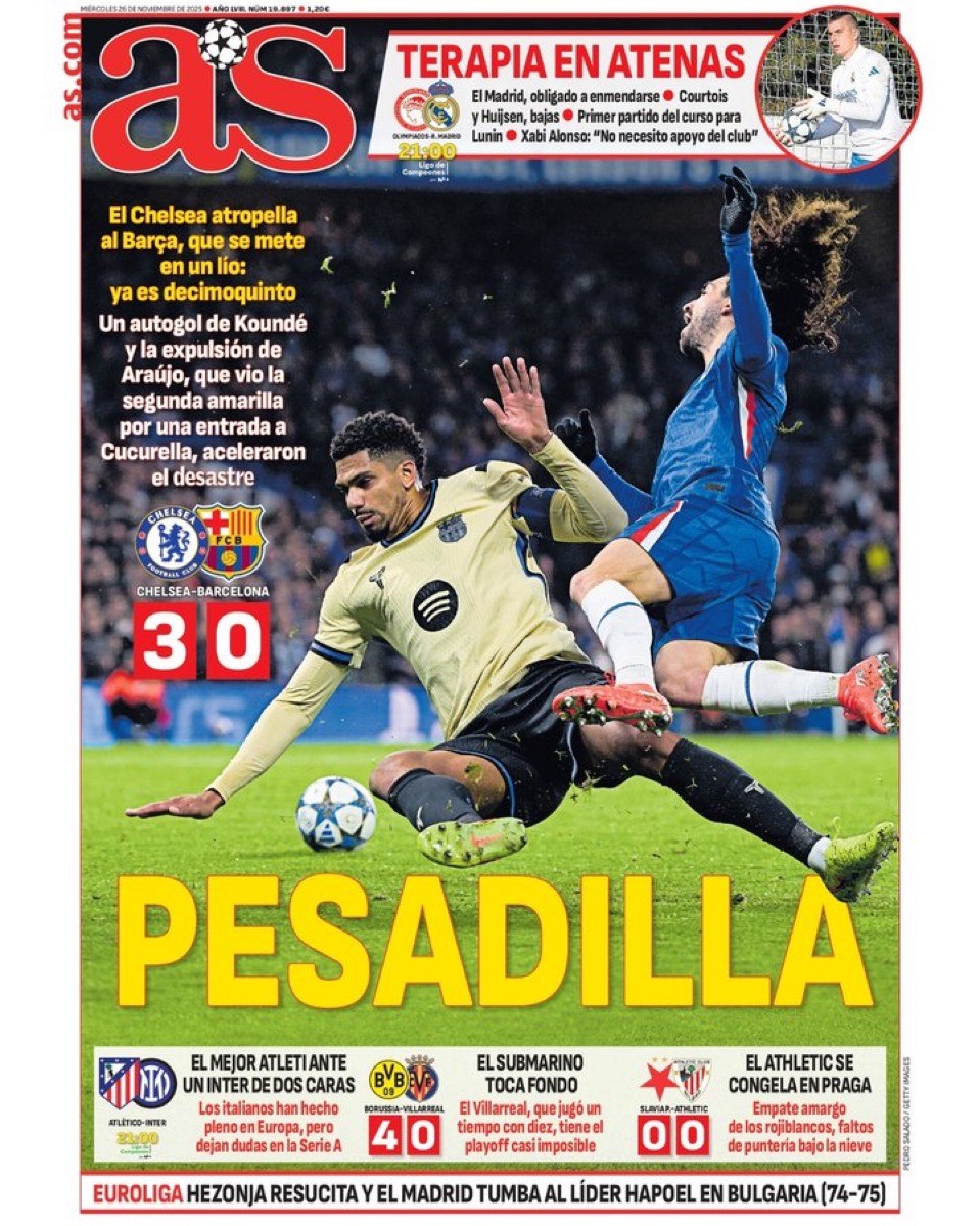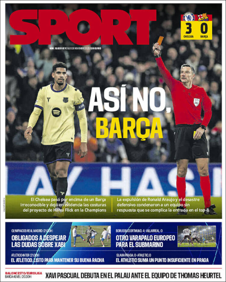 La prensa cataculé, por lo que sea, ha amanecido cariacontecida. Como podéis ver en sus lastimeras portadas, aceptan la justicia de la derrota y se revuelven contra Flick y contra la expulsión de Araujo, que de algún modo marcó el encuentro. A nuestro juicio, fueron claramente avasallados por los locales, con el surgimiento de las correspondientes dudas sobre su proyecto. A pesar de que el calendario de esta fase de Champions que les queda es irrisoriamente fácil, no está claro que los blaugranas se clasifiquen entre los ocho primeros.