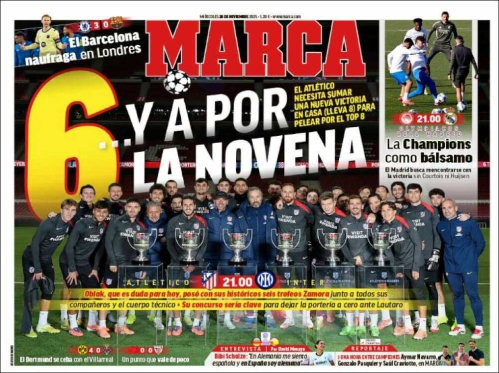 Para finalizar, tenemos la delirante primera plana marquista. No traen como argumento principal la derrota culé en Stamford Bridge. Tampoco la previa del importante choque que esta noche enfrentará a nuestro Madrid con el Olympiacos. No. La portada es para el Atleti, que también juega hoy, y además una doble página.