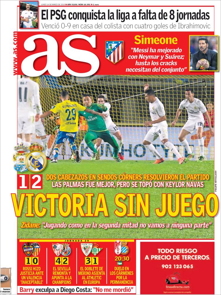 Jugaba ayer el Madrid con mi segundo equipo. Hoy he tenido que aguantar eso de que "Las Palmas mereció ganar" como millones de veces. Pero no fue así. Un providencial Case metió el testarazo de la victoria con el partido casi terminado. Eso es lo que cuenta, sumamos los 3 puntos. Vi a Zidane enfadado por vez primera desde que está de entrenador. Estos partidos de liga deben servir como probatura para la competición en la que sí estamos metidos de lleno, la Champions. Y creo que el de ayer ha servido para dar un toque de atención. ZZ no se va a callar ni se va a dejar dominar por los jugadores. Él manda y confío en que pondrá a los que crea más efectivos en cada momento.