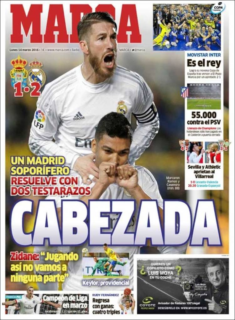 Reconocemos (a veces ocurre, y cuando ocurre nos acusan de condescendencia con la prensa tradicional) que nos gusta la portada de Marca -o de quien sea, pero hoy es la de Marca-. Nos gusta el juego de palabras, que concita en una sola lo soporífero del espectáculo y el modo a través del cual se ha conseguido la victoria-, como nos gusta la foto de Casemiro dedicando el gol a su hija con el clásico gesto.