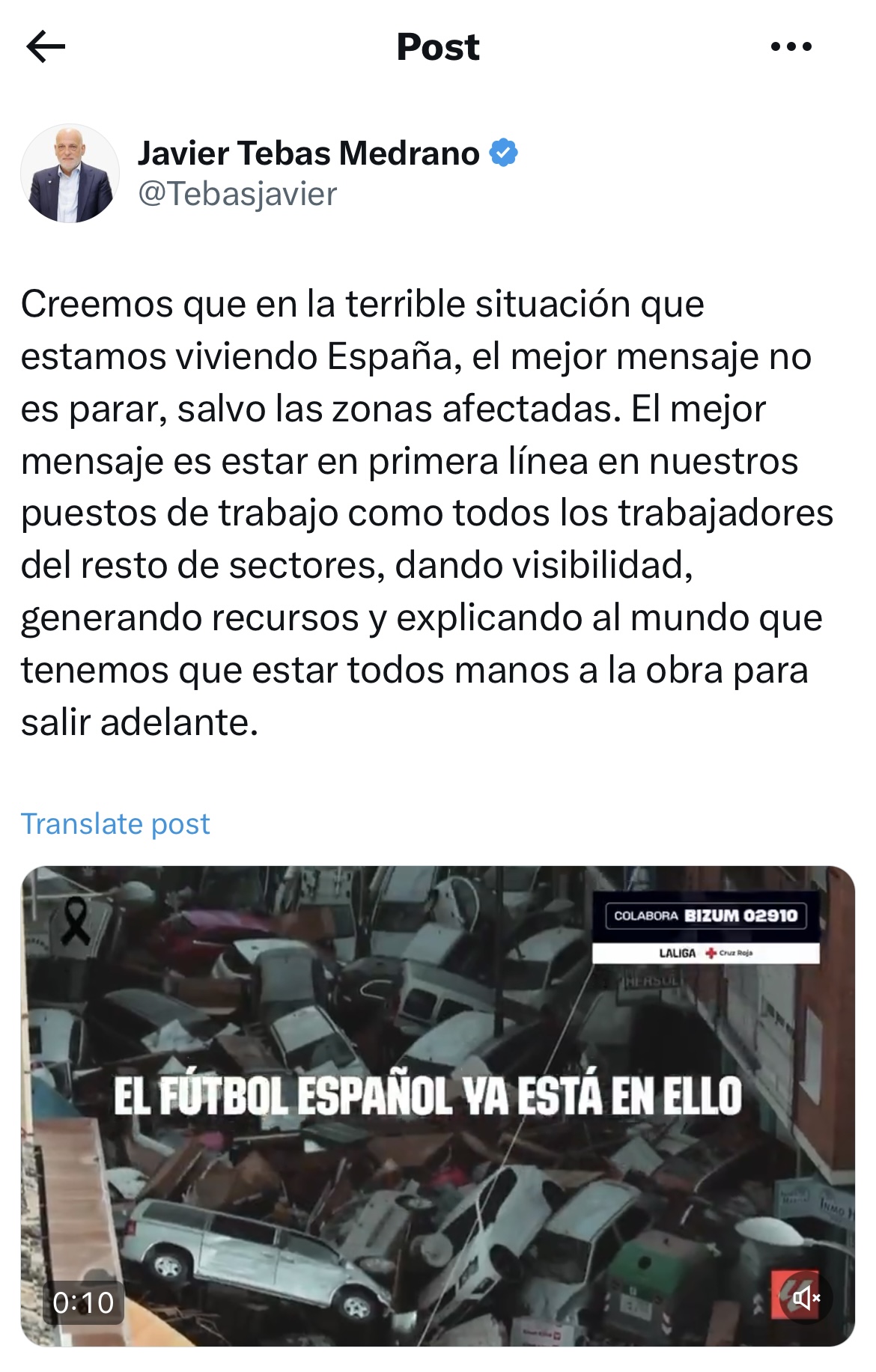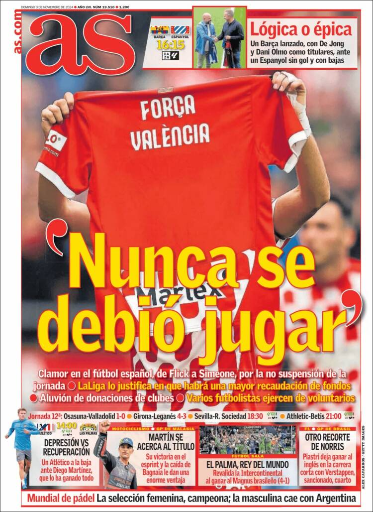 As dice que no se debería haber jugado lo que llevamos de jornada liguera, por solidaridad con lo que está ocurriendo en la zona del desastre. Nadie tiene la cabeza para el fútbol ahora mismo. No se debió jugar y no se debe jugar. Recordemos que la jornada sigue. Señala atinadamente As a Simeone o Flick como destacadas figuras del fútbol que se han manifestado en contra de este intento de aparentar normalidad. Ha habido muchas otras, de Luis Garcia a Eder Sarabia, pasando por jugadores como Miguel Gutierrez. El que se dispute esta jornada es un error monumental, por mucho que Javier Tebas tratara de explicarlo en su cuenta de X. No es solo el fútbol: todo el deporte profesional debió parar.