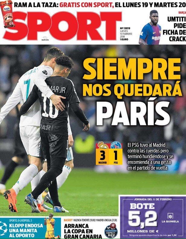 Vamos ya con el postre. A 'Sport' le quedaba París hace unas semanas y se ha conformado con Arthur. El que no se consuela es porque no quiere. Lo que nos ha sorprendido es lo de 'Mundo Deportivo'. Le pega algún palo al PSG, aunque más comedido que el de la 'Ouija', pero habla sin tapujos sobre la superioridad madridista y destaca el partido de Cristiano, Lucas Vázquez y Asensio. Suponemos que el responsable de esto se encontrará ya buscando empleo junto con Unai Emery, pero, oye, nos quitamos el sombrero.