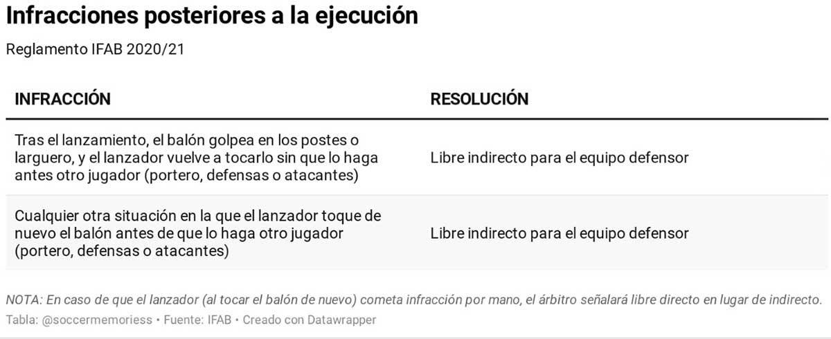 He decidido dejar fuera del artículo lo que ocurre en caso de que intervenga un agente externo que afecte (o no) a la trayectoria del balón durante el lanzamiento. Me parece innecesario enfangar el tema, cuando es algo que no ocurre prácticamente nunca en fútbol profesional.
