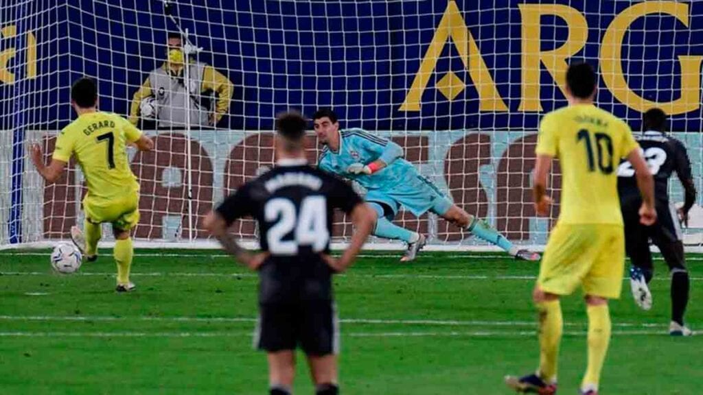 - ¿Qué hubiese ocurrido si Courtois hubiese tenido los pies sobre la línea? – Como Gerard marca el penalti, habría que repetirlo igualmente (infracción de jugador de equipo atacante). De haberlo fallado, libre indirecto para el Madrid.