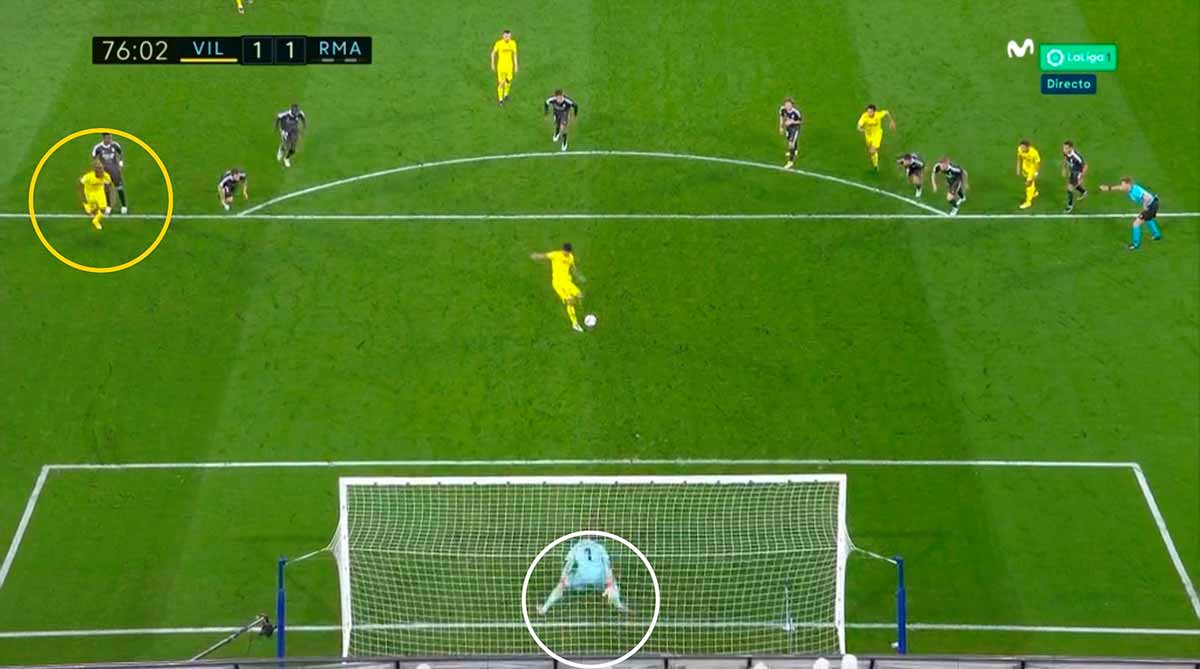 - además pisan la línea, pero se quedan parados, excepto Lucas Vázquez si no recuerdo mal. Es decir, sin poder intervenir en el rechace pero expuestos a que el VAR revise y sancione (como de hecho acabó ocurriendo).