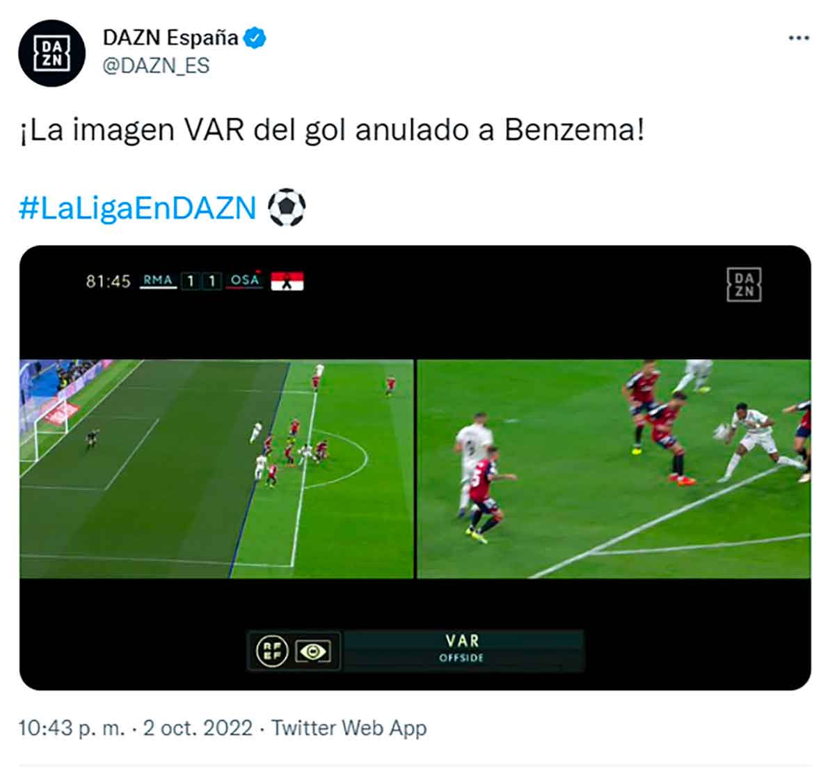 Este es el tuit que publicó DAZN con la imagen del fuera de juego: