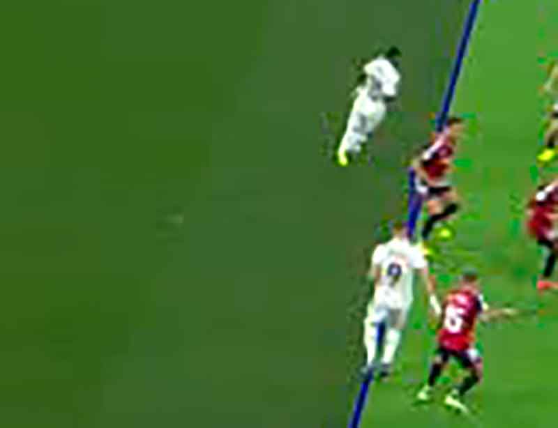 ¿Qué es eso? ¿Se ha colado un preescolar en la sala VOR y ha dibujado con su rotulador la línea? ¿Por qué zigzaguea? ¿O no zigzaguea y lo que ocurre es que el jugador de Osasuna se ha apoyado en ella con el codo y la ha doblado? Es una tomadura de pelo de dimensiones ciclópeas. Son errores groseros que una liga como la española no puede permitirse. En realidad, no puede permitírselo ninguna liga honesta. Además, no es la primera vez que sucede, recordemos la pierna de goma de Odriozola, por ejemplo.