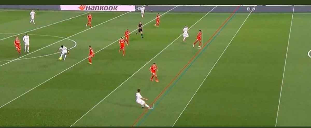 Podemos observar varias cosas. La más obvia, que el momento elegido para trazar la línea es el menos favorable a los intereses del Madrid porque el frame seleccionado es de un momento posterior a la salida de balón del cuerpo de Rodrygo tras el despeje del defensor. Pero no es solo el momento menos favorable para los intereses del Madrid, sino el menos favorable respecto a la norma. De entrada, la revisión nace contaminada por un error inicial que invalida todo.