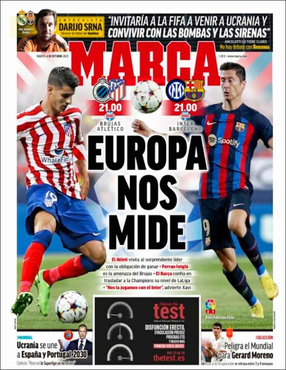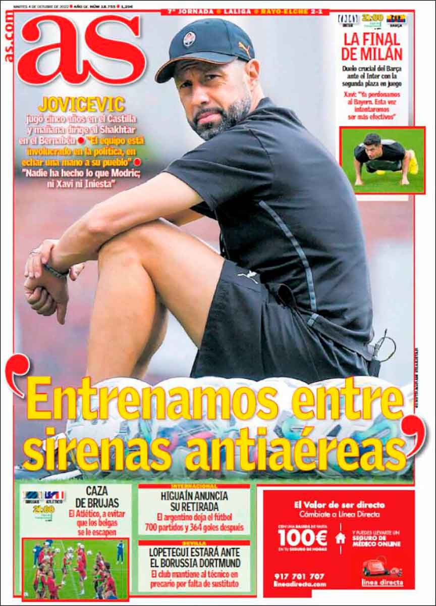 As como noticia principal y Marca en la franja superior destacan lo peligroso del día a día del Shakhtar, rival del Madrid mañana en Champions. Marca entrevista a Darijo Srna, Director de fútbol del club, quien “invitaría a la FIFA a venir a Ucrania y convivir con las bombas y las sirenas”.