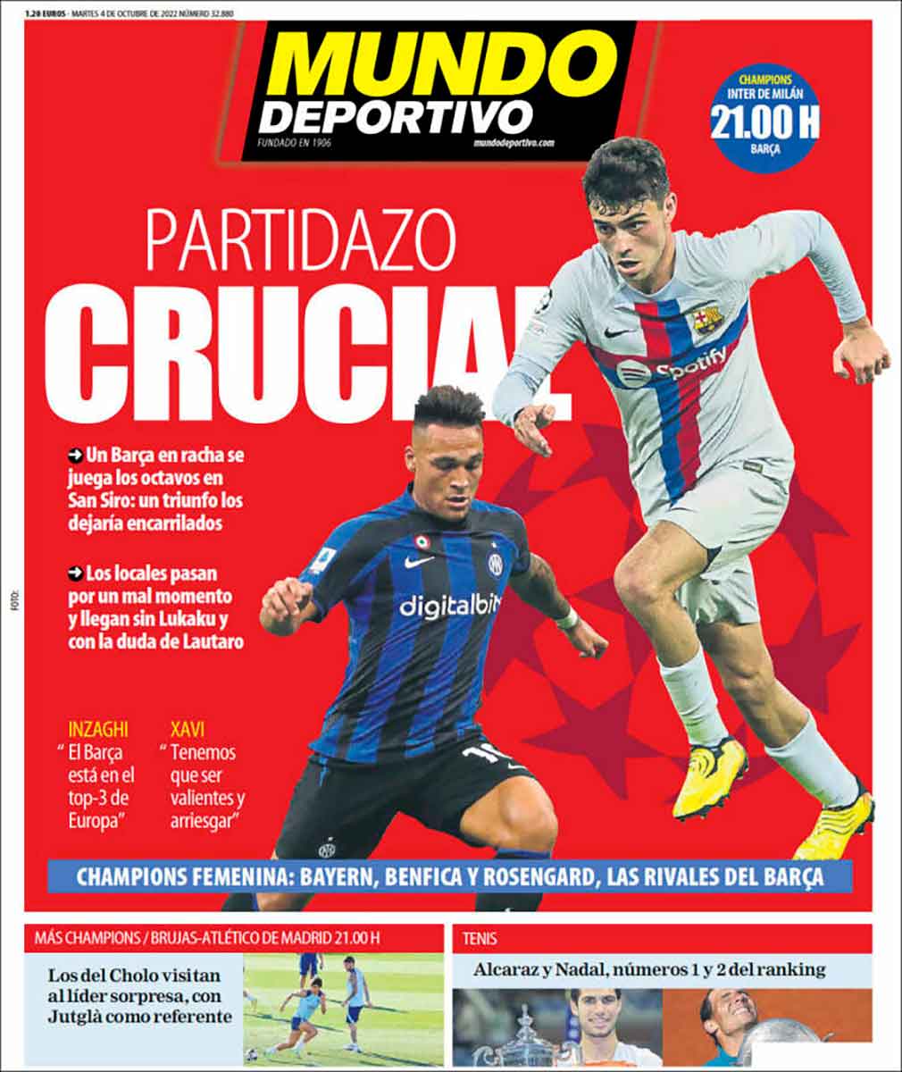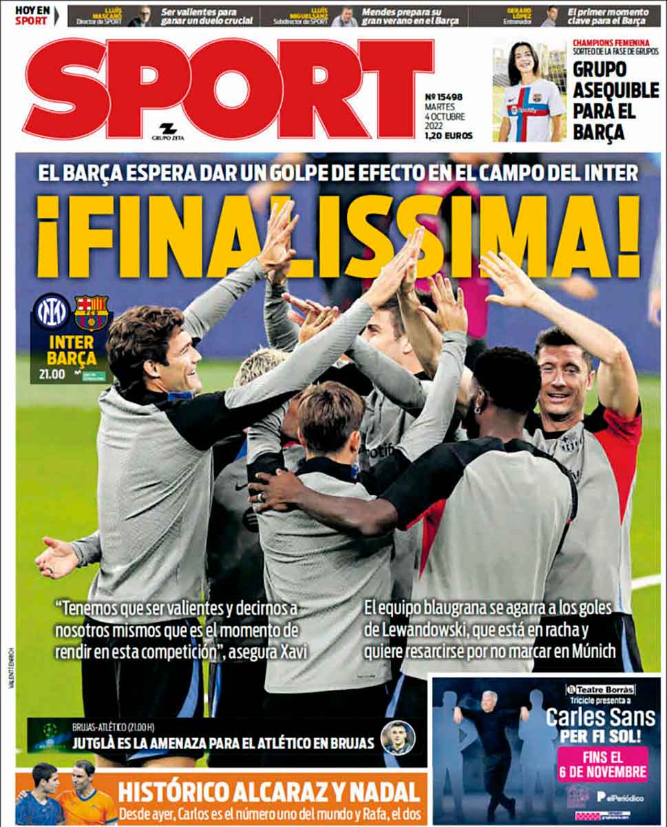 Mundo Deportivo y Sport se centran en el Inter-Barça de esta noche. Los de Godó, además, dedican un hueco al segundo equipo de los culés, el Atleti, que se enfrenta al Brujas a la misma hora.