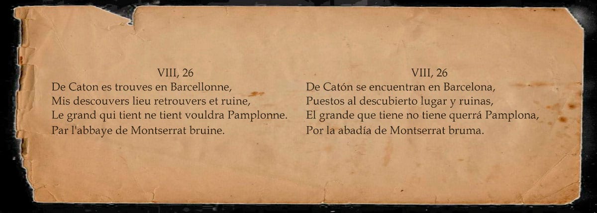 Y Nostradamus se pone algo faltón con el equipo culé, pero lo hace con notable sutileza al decir "De Catón se encuentran en Barcelona".  Un contemporáneo suyo, el escritor Jacques Amyot, dejó escrito que en el siglo XVI, y como burla, se llamaba "catones" a quienes se mostraban graves y severos en palabras y desordenados y viciosos en los hechos.