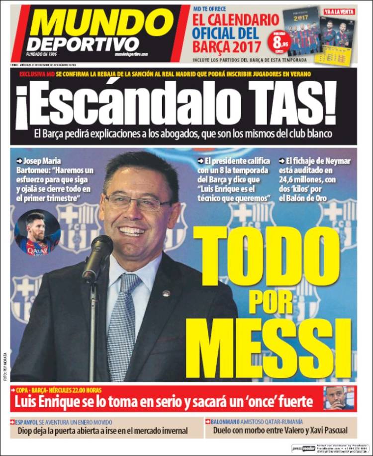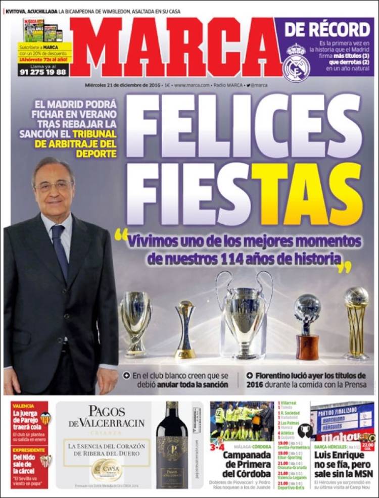 Una maravilla, amigos (¿?) de Marca. Esta síntesis entre la copa navideña con la prensa del presidente del Madrid y la noticia del día (la rebaja de una ventana en la posibilidad de fichar por parte del TAS) nos parece un feliz hallazgo. Quede claro que el club no ha quedado ni mucho menos satisfecho con la decisión del TAS, que reconociendo lo absurdo de la sanción (los casos de los menores estaban clarísimos, incluyendo, pásmense, a los hijos de Zidane) no llega sin embargo a dejarla sin efecto totalmente, manteniendo la prohibición de fichar en el próximo mercado de invierno, aunque abriendo para la entidad blanca el de verano. Se ha despachado a gusto en su comunicado oficial el club, achacando "falta de coraje" al tribunal para anular la sanción en su integridad, términos poco comunes en el lenguaje generalmente muy medido y hasta melifluo de este tipo de comunicaciones.