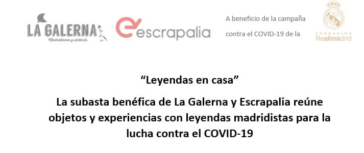 Desde hoy y hasta el próximo viernes día 24 de este mes, la web de subastas Escrapalia.com permite visualizar los lotes subastados como parte de la iniciativa #LeyendasEnCasa, y pujar por ellos en tiempo real. El dinero recaudado irá íntegra y directamente a la cuenta habilitada para la lucha contra el virus por parte de la Fundación Real Madrid, que aportará también varios lotes de valiosísimos pedazos de la Historia del Mejor Club del siglo XX, desde camisetas firmadas por plantillas campeonas de Europa a verdaderos incunables del Real Madrid más primigenio.
