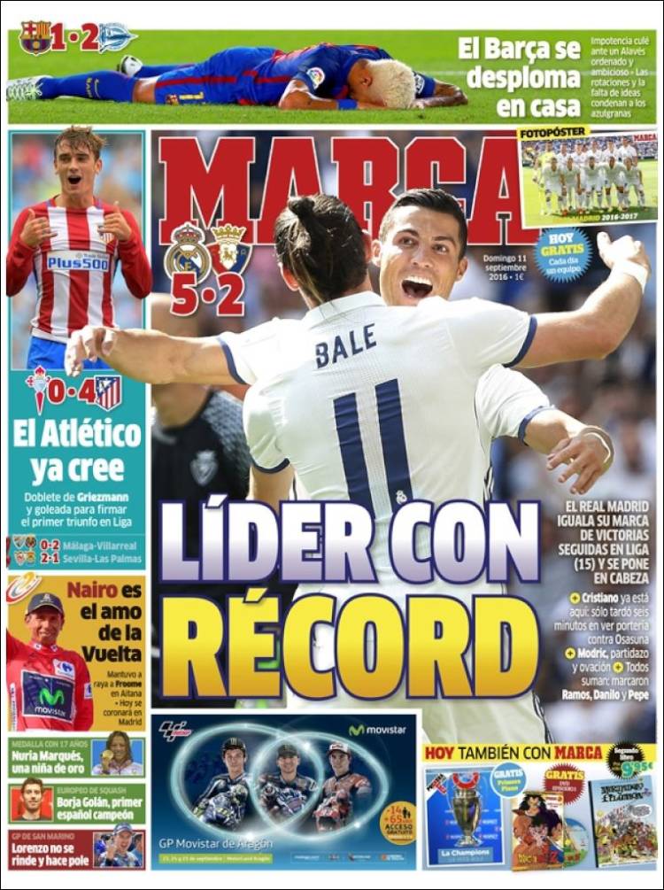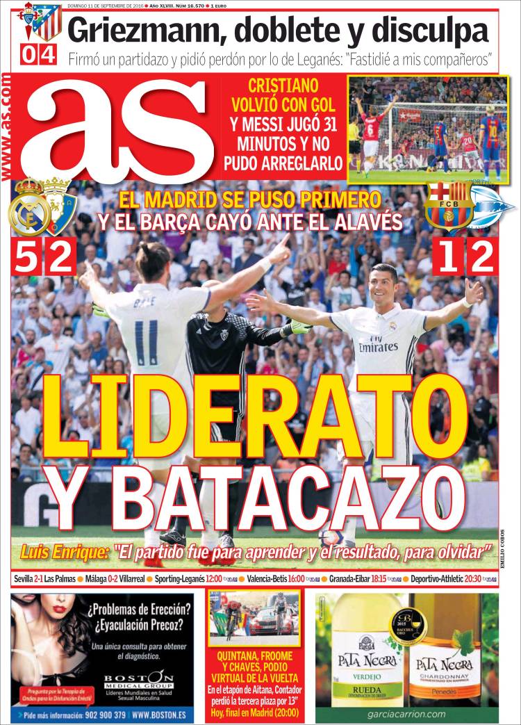 Tal vez nuestra hipótesis no sea la más verosímil, pero el Portanálisis nos ha enseñado que lo verosímil y la prensa deportiva no casan del todo bien, así que demos por bueno nuestro aparente delirio. Si Graham Greene tenía un hombre en La Habana, el madridismo tiene un hombre en Can Barça, camuflado de culé en una promoción de Mundo Deportivo. Hasta ahora nada hacía sospechar su verdadero cometido, pero hoy los astros del marketing se han alineado con Mendizorroza y con las rotaciones de Luis Enrique para que nuestro hombre cumpla con el trabajo que tenía asignado desde la meseta. Bravo por su arrojo. Debut de Jasper Cillessen debidamente consignado. Misión cumplida. Trompazo mayúsculo y liderato, tal y como debidamente refieren las portadas de Madrid que vienen a continuación.