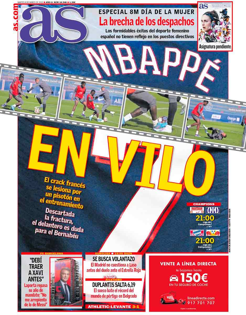Quienes más se han asustado por la posible baja de Mbappé han sido los culés, podéis rebobinar el Portanálisis hasta la portada de Sport para comprobar cómo ponían el grito en el cielo en el faldón: “¡Peligra Mbappé!”. Están acongojados. ADN Barça.