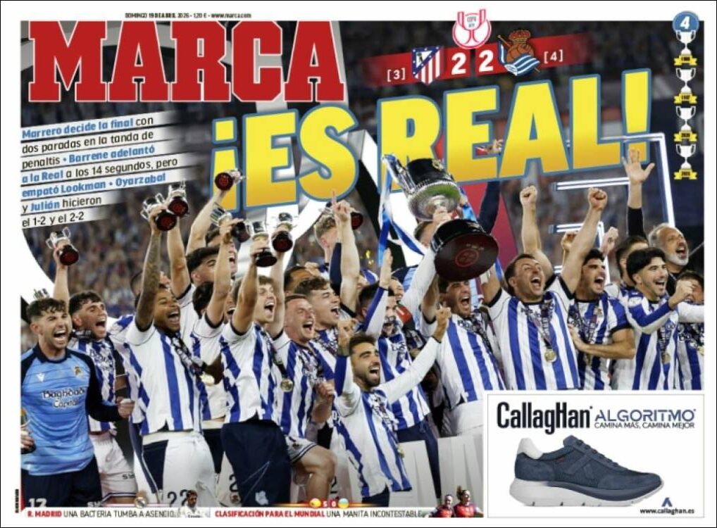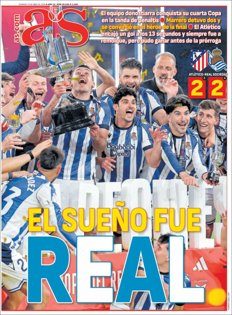 Las primeras planas del día reflejan, de manera en general edificante, el triunfo de la Real, que se sustentó sobre la base de un gran esfuerzo colectivo y del acierto en los penaltis del guardameta Unai Marrero. Julián Álvarez lanzó el suyo a un solo toque esta vez, pero no por ello la mandó a la red. En el consejo de redacción de La Galerna hay un par de filorrealistas con corazón blanquiurdín por cuya alegría nos alegramos. Cabe ser del Madrid y de otro mientras se sea del Madrid. Nada que objetar, y felicitaciones.