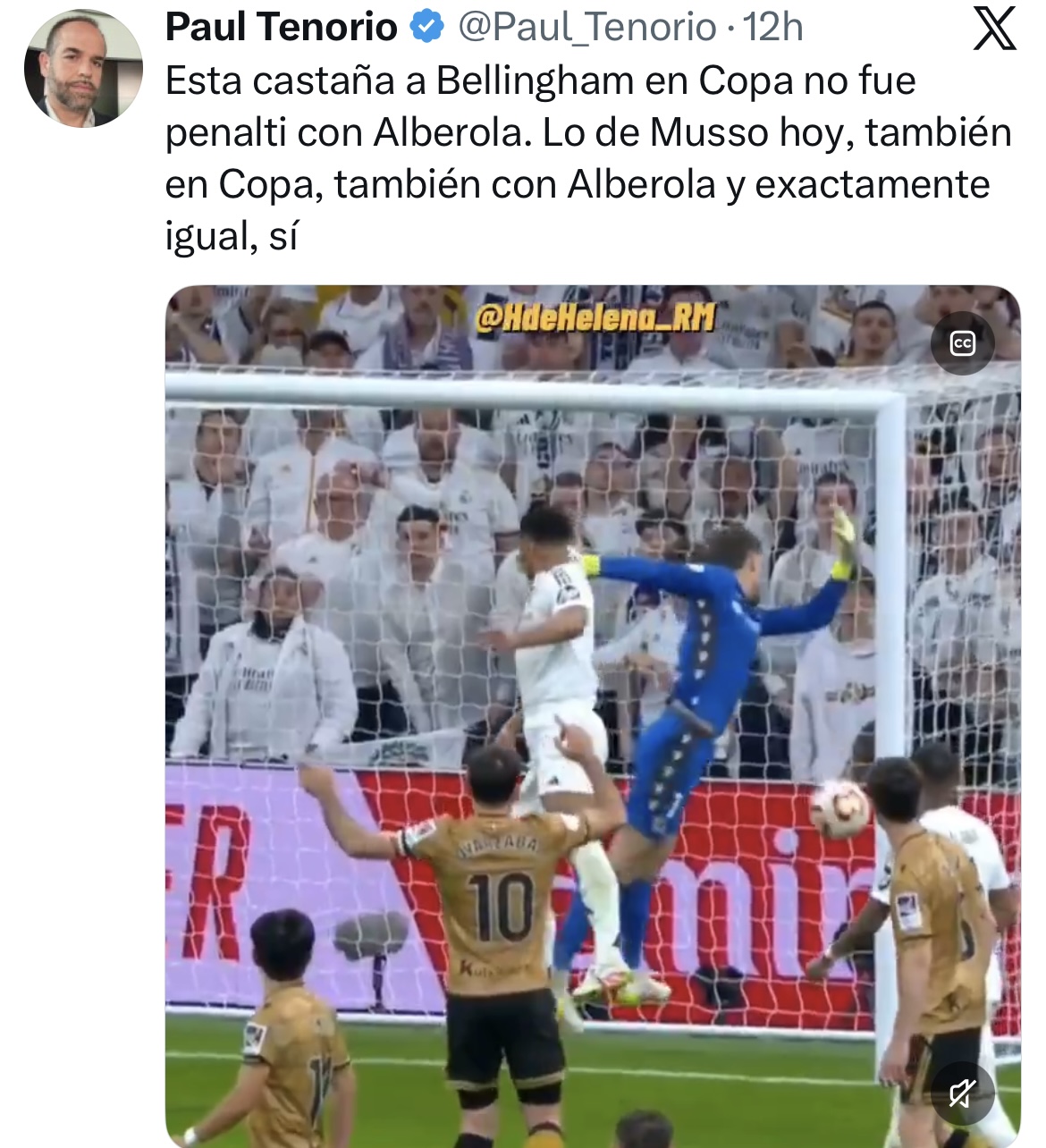 De lo que no hablan las portadas del día, ni señala tampoco ningún gran medio en letra pequeña, es del manifiesto doble criterio del atroz Arberola Rojas. Ayer sí pitó penalti por un manotazo de Musso en área atlética, en una de esas jugadas que todo el mundo llama “residual”. No obstante, en partido también copero del año pasado, también con la Real pero con el Madrid de adversario, el mismo colegiado no se dignó a indicar el punto fatídico por una bofetada idéntica de Remiro a Bellingham.